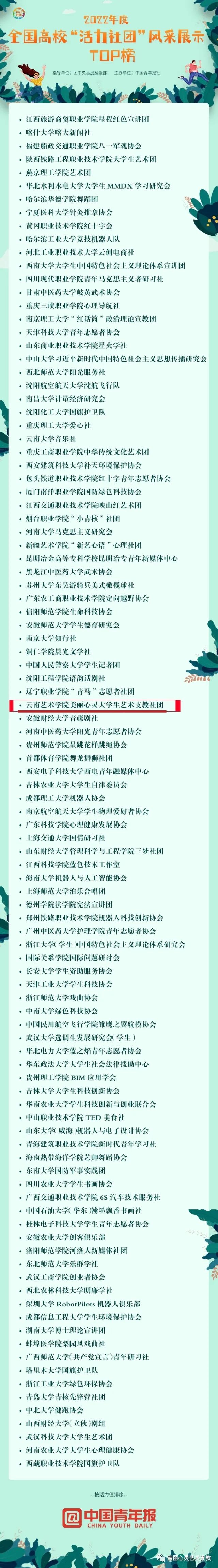 2022年5月起,为深入贯彻“全团抓思想政治引领”“全团大抓基层”“全团抓学校”工作部署,落实《关于改革创新高校共青团工作 切实增强思想政治引领实效的若干措施》,激发高校社团活力,共青团中央基层建设部指导中国青年报社开展了2022年度高校“活力社团”风采展示活动。日前,经过校内选树、省级展示、全国展示等环节,2022年度全国高校“活力社团”TOP榜公布,beat365在线唯一官网登录美丽心灵大学生艺术支教社团上榜啦!