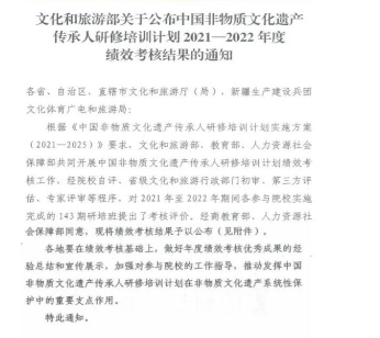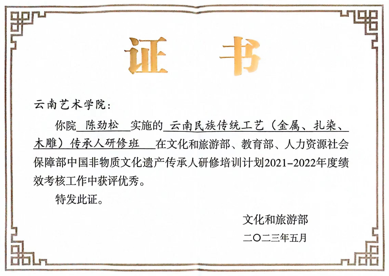 5月9日至11日,中国非遗传承人研修培训计划现场交流活动在云南昆明举办。活动旨在总结工作进展情况,交流优秀教学经验,持续提升非遗系统性保护水平。活动期间,文化和旅游部发布了中国非物质文化遗产传承人研修培训计划2021-2022年度绩效考核结果并颁奖。考核围绕研培班的教学组织、教学管理、保障机制、教学效果及反馈评价等五个方面进行。学校实施的“云南民族传统工艺(金属、扎染、木雕)传承人研修班”获评优秀。
