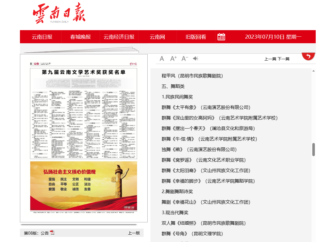 本届云南文学艺术奖评选体现新时代要求,坚持高质量标准,聚焦2019年至2021年期间,全省文学、戏剧、美术、音乐、舞蹈、等13个门类,共推出获奖对象140个(含特别荣誉奖6个),集中展示了近年来全省文联系统和广大文艺工作者的优秀创作成果和良好精神风貌。