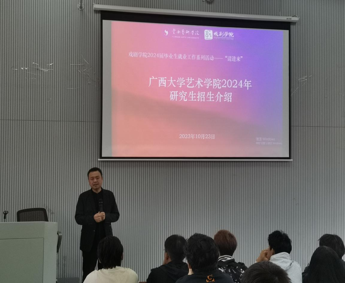 为进一步调动学生考研积极性和主动性,10月23日中午,广西大学艺术学院院长胡红一教授应邀来我院开展研究生招生宣讲。2024届戏剧学系戏剧影视文学系毕业生和2025届这两个专业毕业生参加了此次宣讲会。会上,胡红一教授从广西大学艺术学院的发展历史、专业设置、师资力量、学科建设、科创平台、科研情况、招生数量等方面进行介绍。接着就专业研究方向、报考要求、初试科目等进行细致分析。并在会上介绍了往届学生的就业情况和人才培养效果。胡教授表示,云艺戏剧学院的学科建设、人才培养、专业优势是有目共睹的,云艺戏剧学院的学生钻研刻苦、严谨笃学、热情创新是有目共见的,希望同学们踊跃报考广西大学,期待与同学们相约南宁广西大学。本次会议,由戏剧学院党委书记刘恩权同志主持,杨军院长以及学生科全体同志参加。