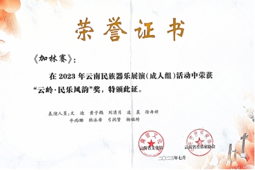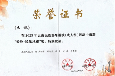 在云南省文化馆与云南省音乐家协会主办的“2023年云南民族器乐展演”中,音乐学院国乐系和作曲系教师尹毅、郭乐、高弘扬和赵云龙共同指导的“云上弦歌民族室内乐团”参与比赛并斩获佳绩比赛中,演奏高弘扬作曲的《云山阙歌》《云旎》和邹航编曲、梁聆聆改编的《加林赛》分别荣获成人组“云岭·民乐风华”(一等奖)、“云岭·民乐风雅”(三等奖)和“云岭·民乐风韵”(二等奖)。