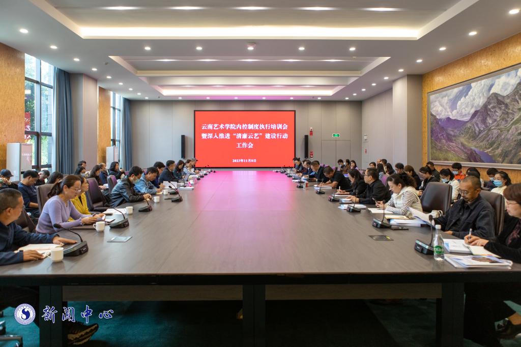 为深入推进学校内部控制体系建设,提高学校内部管理水平,推动“清廉云艺”建设工作走深走实。2023年11月8日,beat365在线唯一官网登录内控制度执行培训会暨深入推进“清廉云艺”建设行动工作会在呈贡校区图书馆会议室召开。全校39个职能部门、教学单位主要负责同志及财务经办人员共70余人参加会议。学校党委副书记、院长欧阳俊虎在会上作动员讲话,党委委员、副院长蒋锋主持会议。
