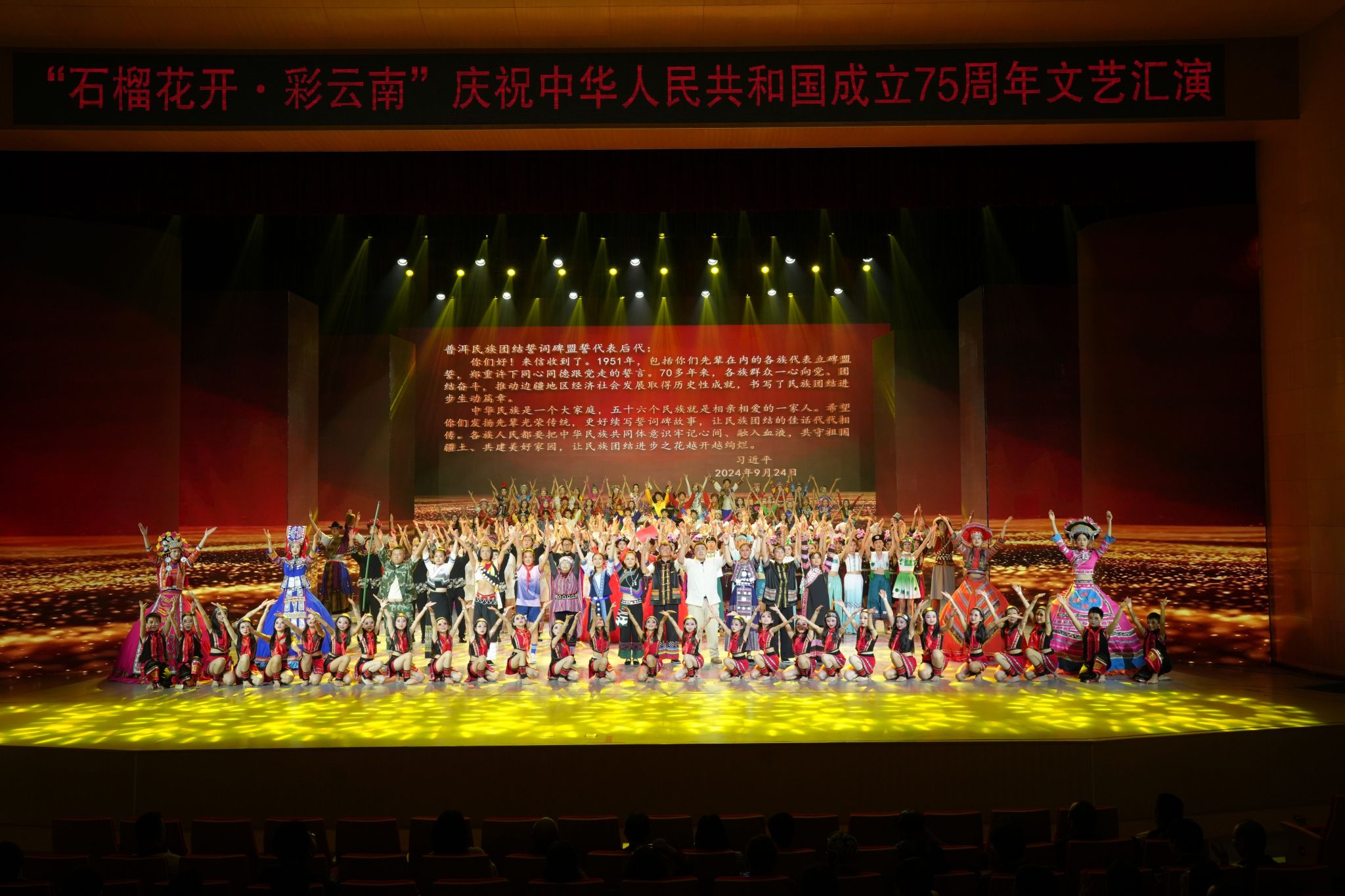 2024年10月18日,由中共云南省委统战部、云南省民族宗教事务委员会、云南省教育厅主办,云南省民族团结进步促进会承办的“石榴花开·彩云南”——庆祝中华人民共和国成立75周年文艺汇演活动在云南文化艺术职业学院举行。本次文艺汇演以普洱民族团结誓词碑为创作灵感,回顾并展现了云南各民族共守祖国疆土、共建美好家园的光辉历程。