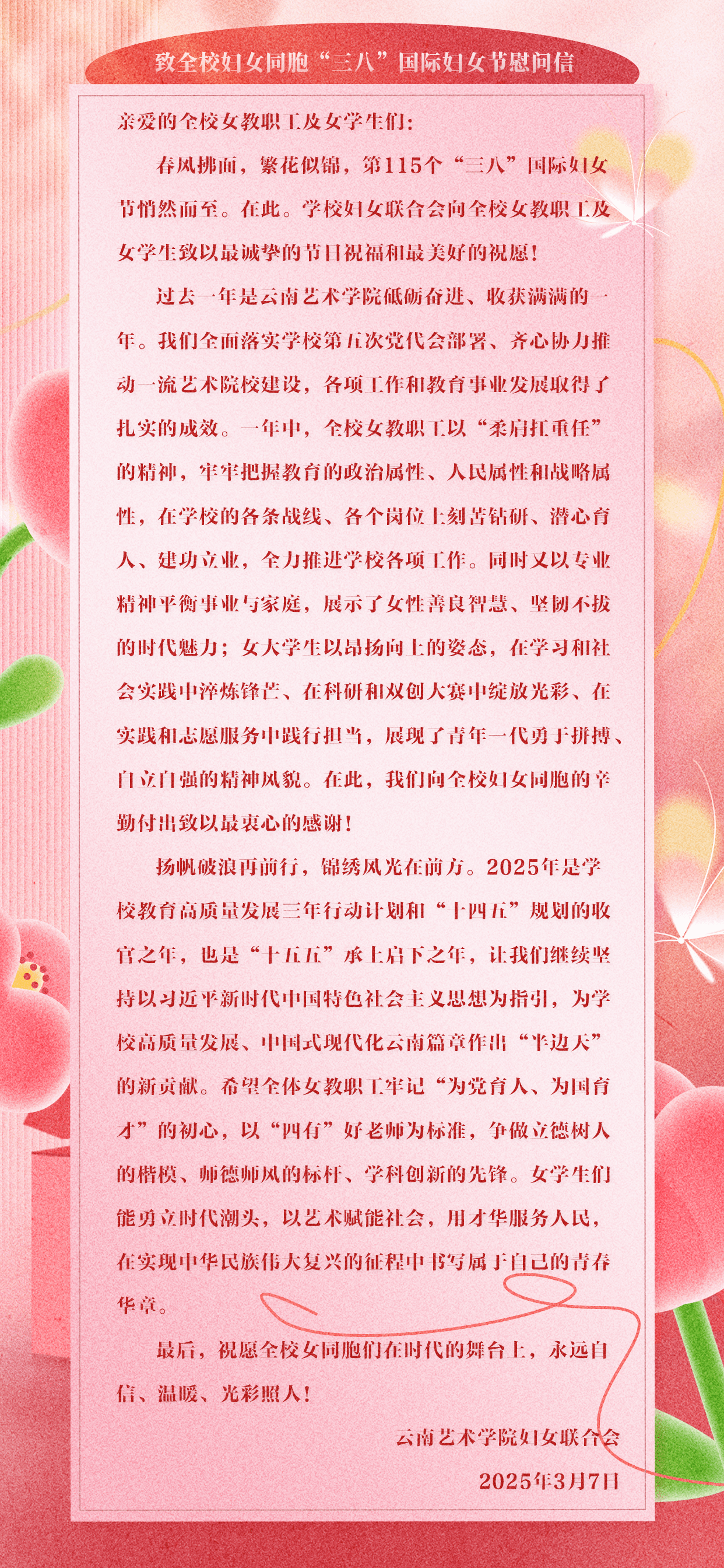 致全校妇女同胞“三八”国际妇女节慰问信