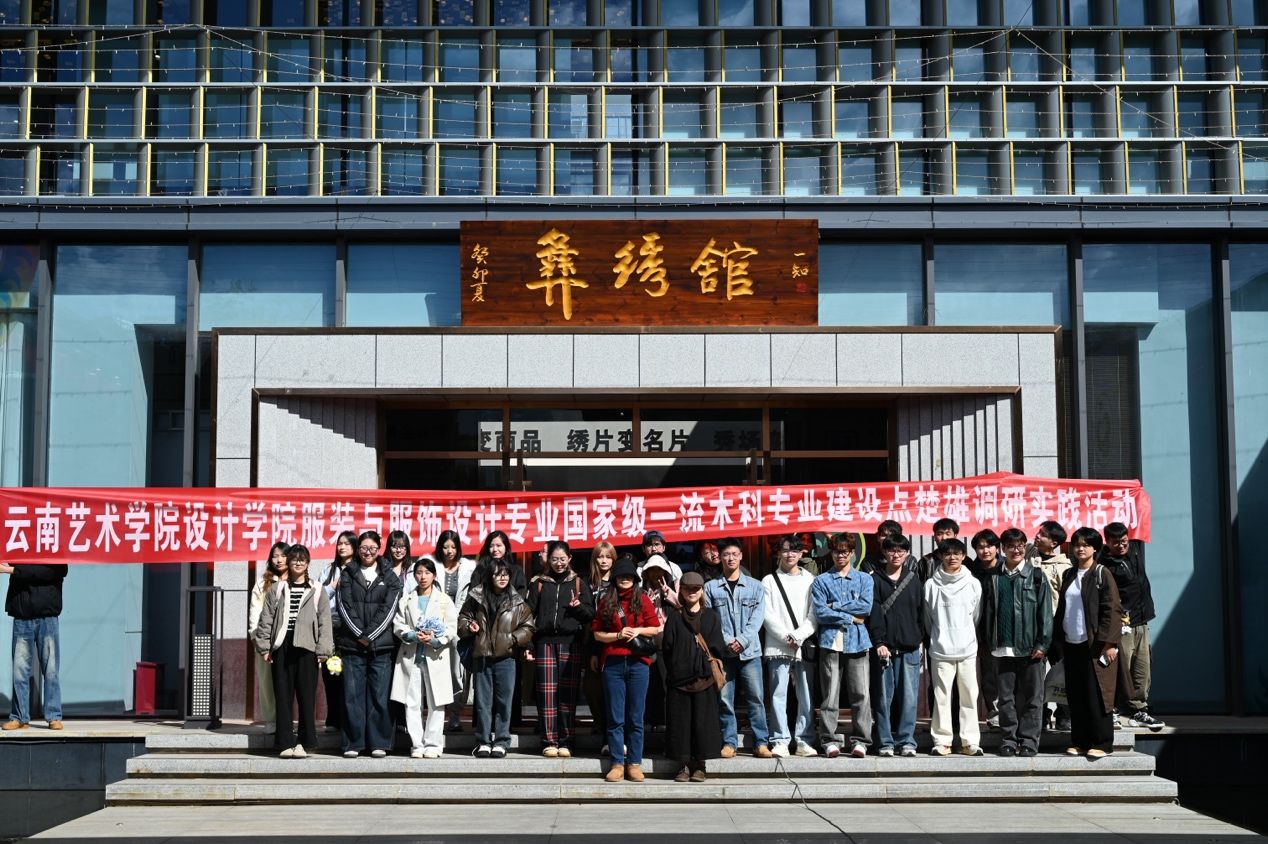 在创作准备阶段,师生团队深入楚雄彝族自治州开展田野调研与文化考察,走访彝族博物馆、非遗传习馆及传统村落,实地了解《梅葛》的叙事结构与文化价值,搜集彝族服饰的纹样、工艺和色彩体系,夯实了毕业设计的文化基础与现实根基。调研过程中,同学们不仅汲取传统技艺的灵感,更在对话中理解民族文化的生命力与传承意义。