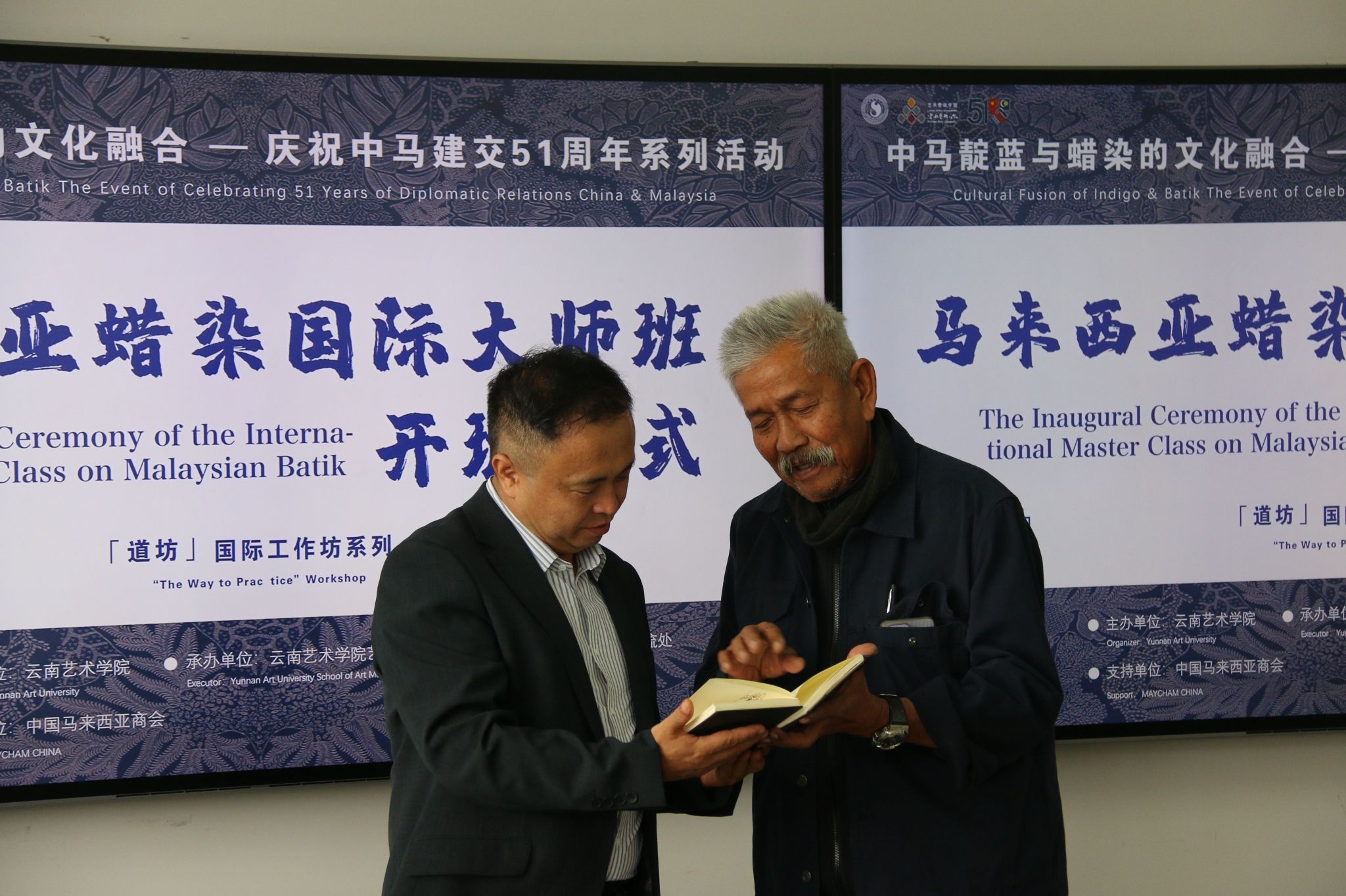开班仪式的最后,纳吉布教授赠予了马来西亚蜡染纹样图册,蒋锋副院长则回赠了代表云南非遗的扎染作品。这不仅是文化友谊的象征,更是中马文明互鉴的生动体现。