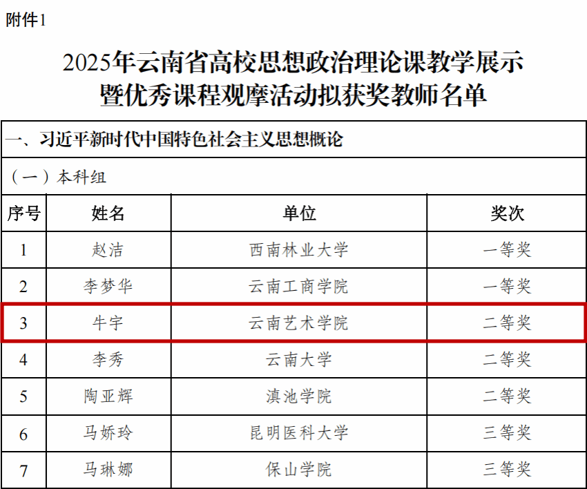 2025年5月29日至30日,由中共云南省委教育工委主办,云南省高校“中国近现代史纲要”课程教研中心、云南民族大学马克思主义学院承办的2025年云南省高校思想政治理论课教学展示暨优秀课程观摩活动在云南民族大学举办。来自全省43所高校的118名优秀思政课教师入围教学展示决赛,比赛分为“本科组”“高职高专组”“研究生课程组”等共三个组别。我校马克思主义学院6位教师参赛,其中,牛宇、宾岩、朱河锦3位教师分别进入所授课程的决赛阶段。