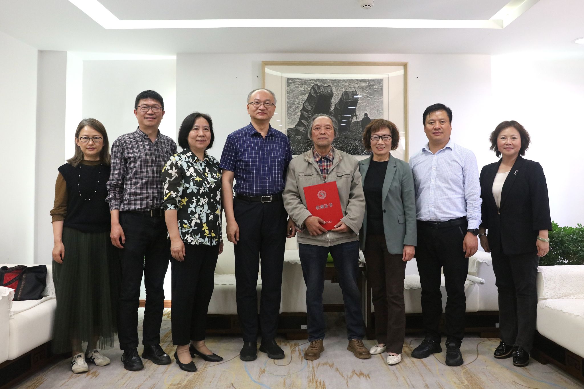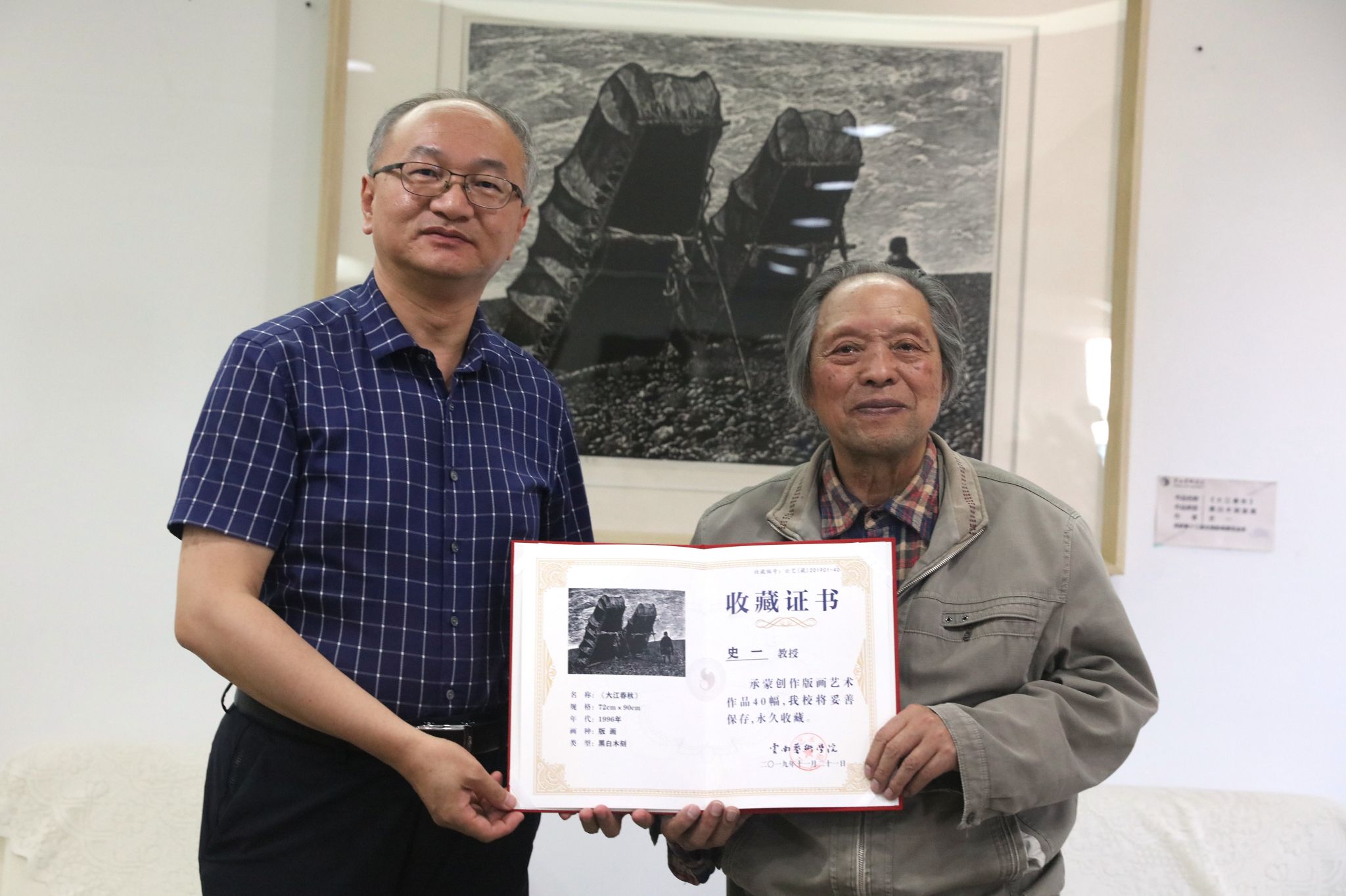 2025年6月5日下午,beat365在线唯一官网登录向史一教授颁发收藏证书仪式在艺术实践中心会议室举行。校党委李建宇书记代表学校为曾获得云南省教育功勋奖的史一教授颁发艺术作品收藏证书,以感谢他向学校捐赠40幅版画作品的义举。