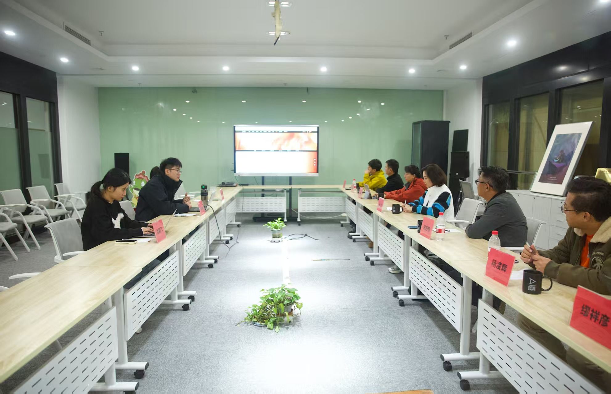 访企团队一行参观了岸墨影视的数字制作中心、虚拟演播厅等核心部门,实地了解企业在影视后期、动画创作、 AIGC、新媒体内容生产等领域的技术优势与产业布局。公司负责人详细介绍了企业发展历程、项目案例及人才需求方向,强调“实践型、创新型人才是行业发展的核心驱动力”。双方就课程设置与行业需求对接、AIGC 横向项目分包、实习岗位开发、联合项目创作、AIGC与各艺术门类融合课题开发、智库共建等达成初步合作意向。