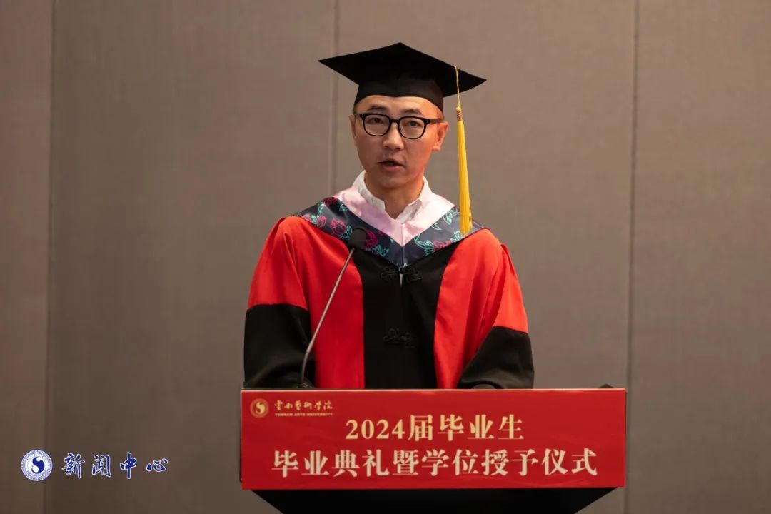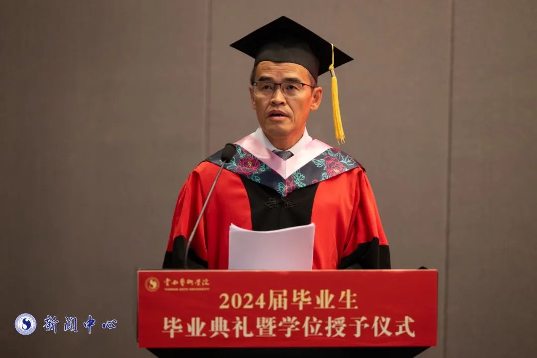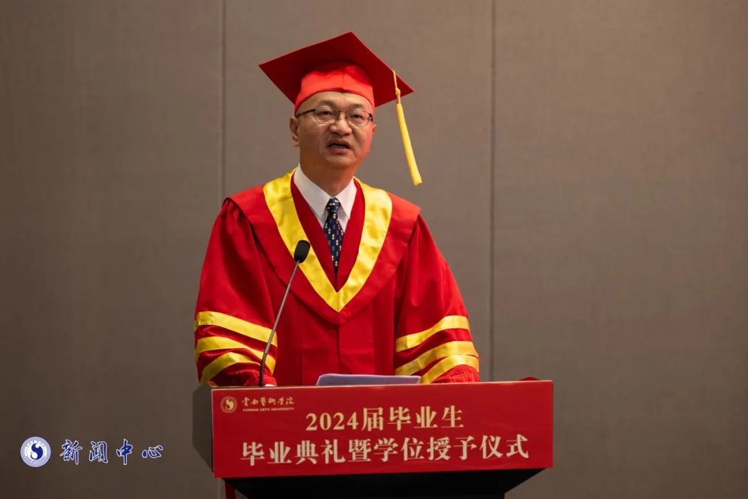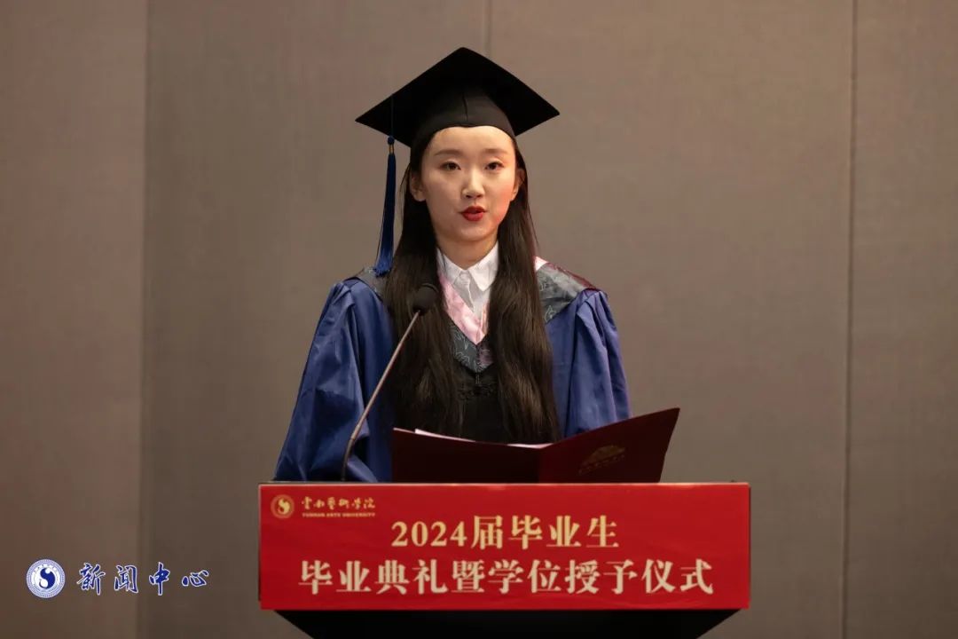 2024届校级大学生年度人物提名奖获得者舞蹈学院杨茜然代表硕士毕业生发言。他表示,作为云艺学子,将牢记母校的教诲,秉持求真务实的精神,不断追求卓越,勇攀高峰。以更加坚定的步伐,更加开阔的视野,去迎接新的挑战。心怀梦想、脚踏实地就一定能够实现自己的理想,成就更加辉煌的明天。