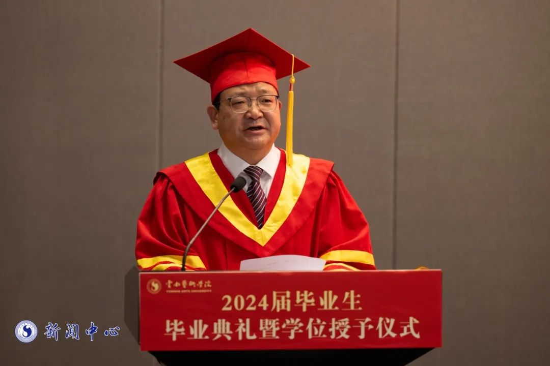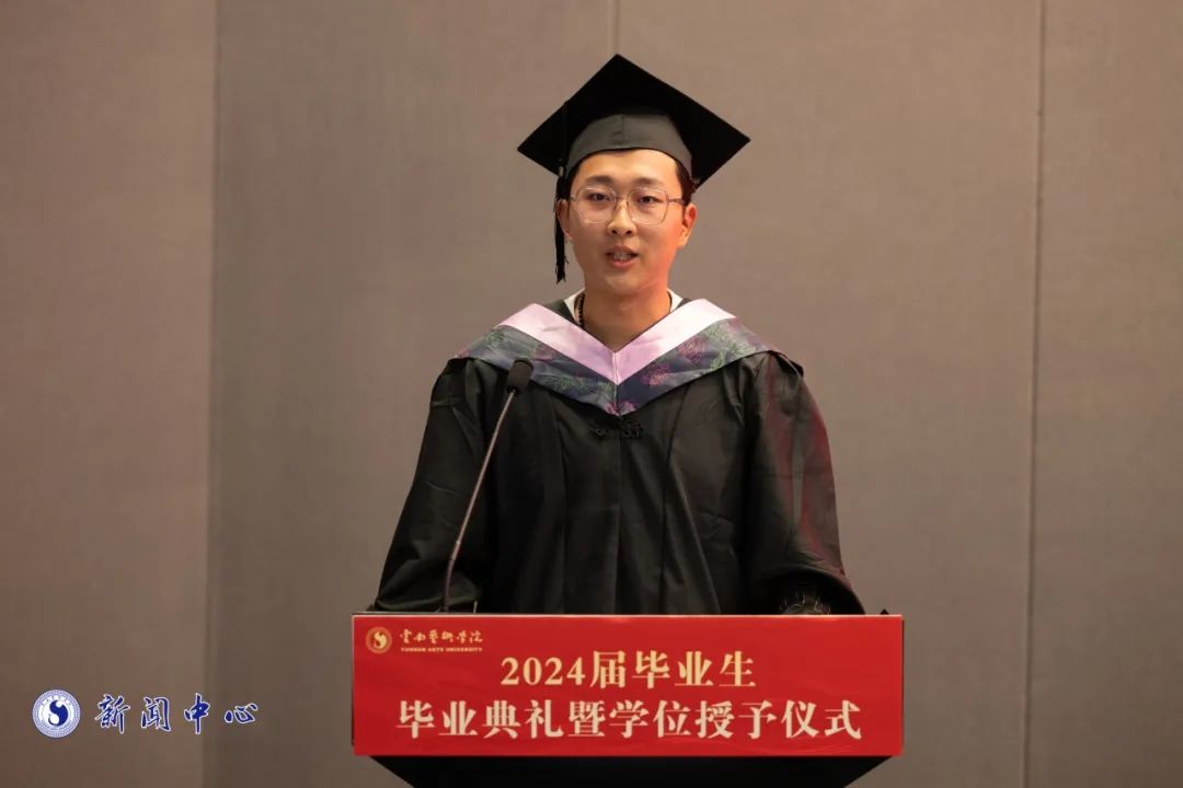 2024届校级大学生年度人物获得者美术学院崔铭航代表本科毕业生发言。他结合学校的发展与个人的成长分享毕业感悟,表示无论身处何地,都将带着云艺的印记,在各个岗位闪耀自己的光芒,铭记历史,珍惜荣誉,传承和发扬云艺人拼搏奋斗的精神。