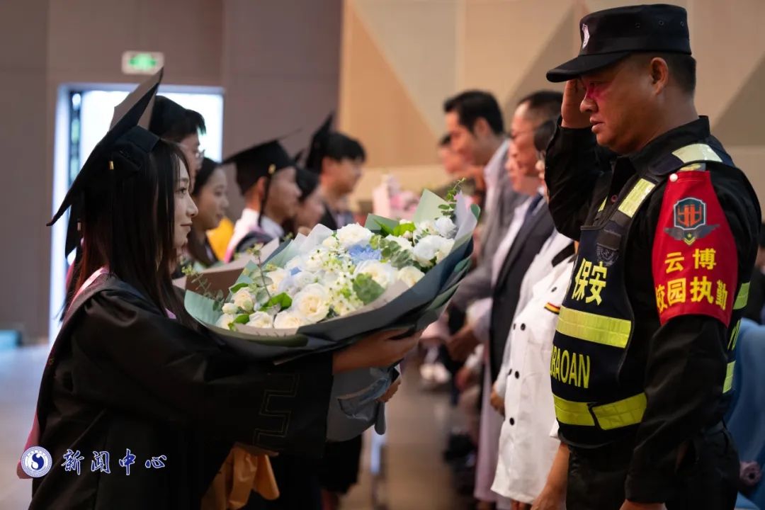 毕业生代表为教师和服务人员代表献花,表达感谢之情。