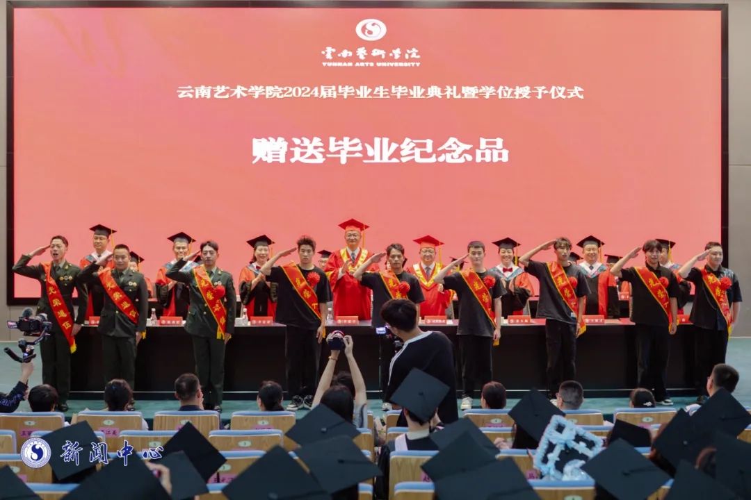 校领导向退役、入伍士兵及二级学院毕业生90名代表赠送纪念品并合影留念。