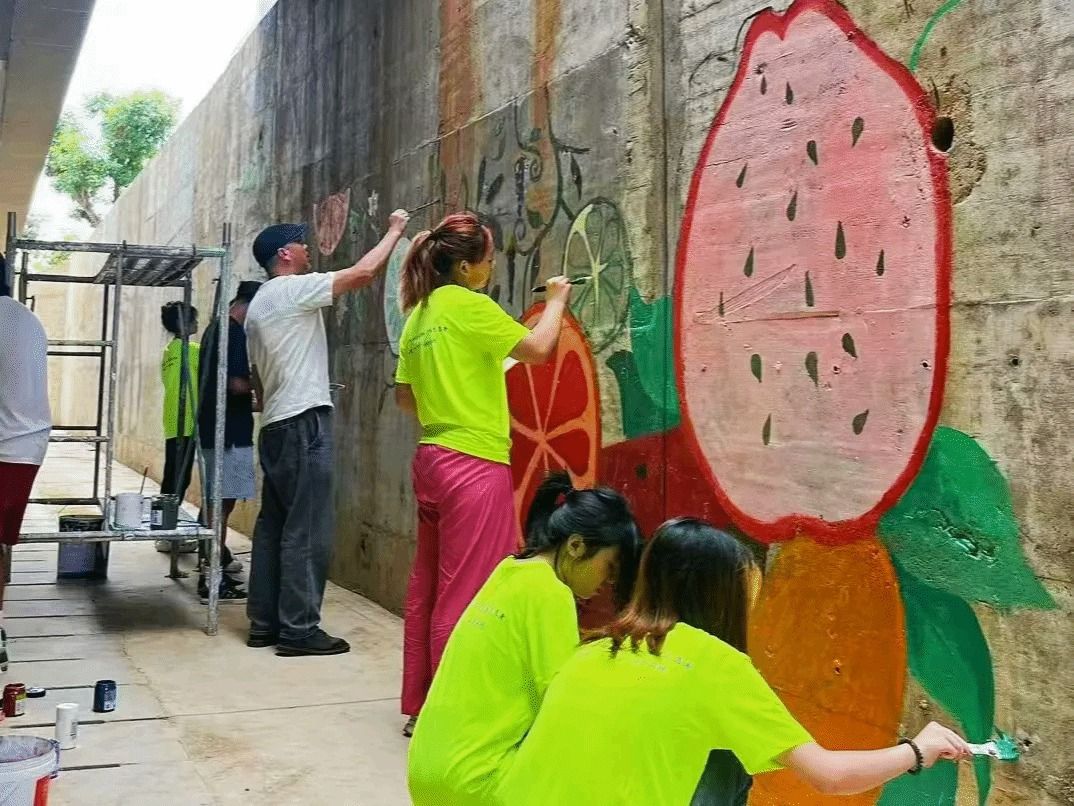 团队走访了万亩柑桔田,对当地企业文化和现代农业有了深入了解。结合专业特长,团队为当地绘制了以农产品为主题的宣传壁画,墙壁被赋予了新的生命,成为了宣传农产品、美化环境的重要载体,为乡村振兴注入艺术的力量。