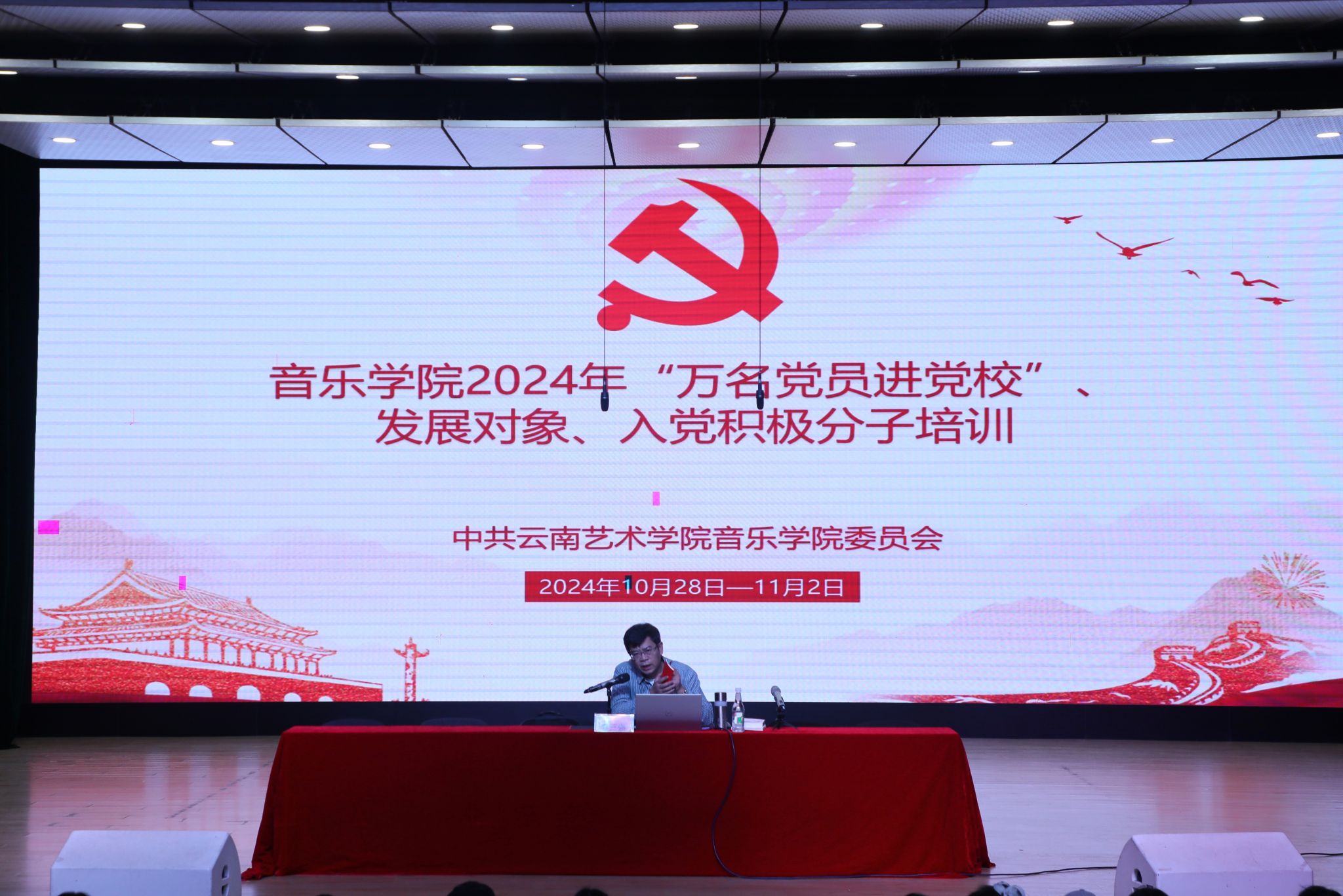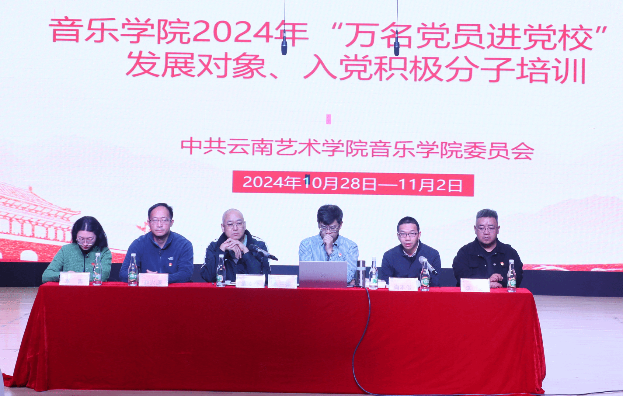 为深入学习贯彻习近平新时代中国特色社会主义思想和党的二十大、党的二十届三中全会精神及习近平总书记考察云南重要讲话精神,动员引领基层党组织和广大党员把思想和行动统一到党中央决策部署和省委、校党委工作要求上来,着力巩固深化党纪学习教育成果,不断提升入党积极分子、发展对象的政治素养,音乐学院于2024年10月28日在安康音乐厅举行2024年入党积极分子、发展对象暨“万名党员进党校”培训班开班仪式。音乐学院党委书记童汝全,马克思主义学院党总支书记李三强,音乐学院、舞蹈学院、影视学院、高职学院专职组织员,以及音乐学院全体党员、2024年备案的入党积极分子、发展对象,舞蹈学院和影视学院发展对象、高职学院入党积极分子,共计290人参加。音乐学院党委副书记、纪委书记肖本俊主持并提出培训纪律要求。