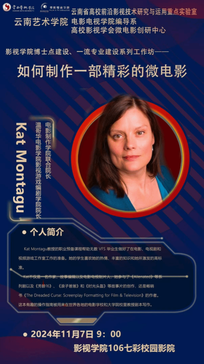 11月7日温哥华电影学院联合院长,著名编剧Kat Montagu女士受学院邀请在影视学院开展了主题为“如何制作一部精彩的微电影”的工作坊。凯特·蒙塔古(Kat Montagu)女士现任加拿大温哥华电影学院影视游戏编剧学院院长、电影制作学院联合院长,是多本影视类畅销书作者。作为有着丰富的影视行业从业经验的编剧和制片人,凯特·蒙塔古从实践性视角出发,仔细分解了一部微电影从立意和创意、剧本创作、制作和拍摄,到后期剪辑和版权发行方面的诞生过程,参加工作坊的同学纷纷表示受益匪浅。