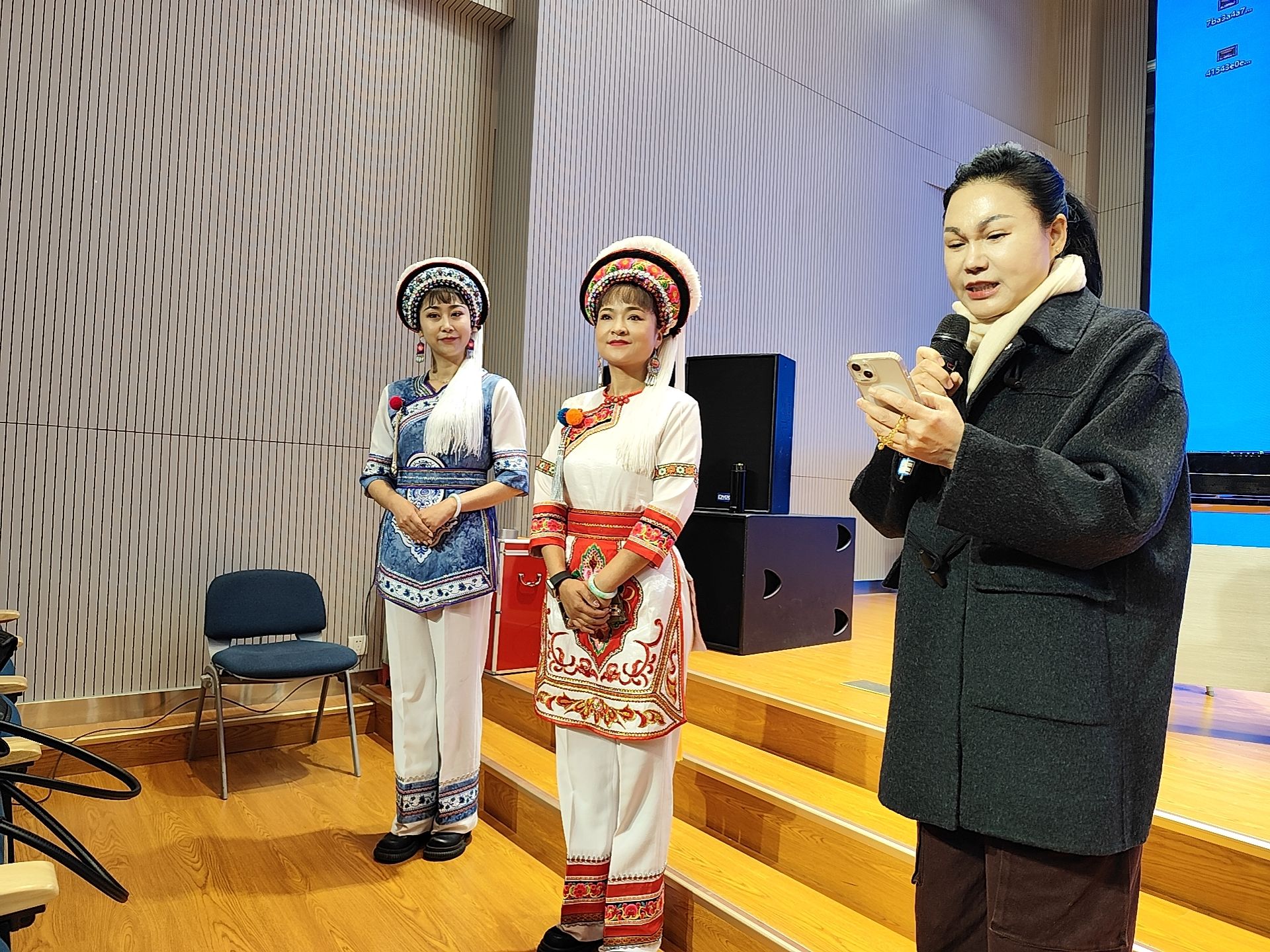 讲座伊始,国家二级演员、中国曲艺家协会会员、云南省优秀青年演员赵雪芳老师首先向在座师生详细介绍了白剧的起源、唱腔特色、表演特征等方面的内容。随后,大理州民族文化工作团优秀青年演员、大理州文艺调演个人表演金奖获得者董润坪老师,向同学们介绍了自己参演的白剧经典剧目《望夫云》,并现场演唱了其中的经典唱段。两位老师还合作演唱了颇具代表性的白剧选段以及白族民歌《麻雀调》《蝴蝶泉边》《锦鸡落下地有声》等曲目,还就白剧演唱发声方法和演唱技巧向同学们进行了细致的讲解与分享。