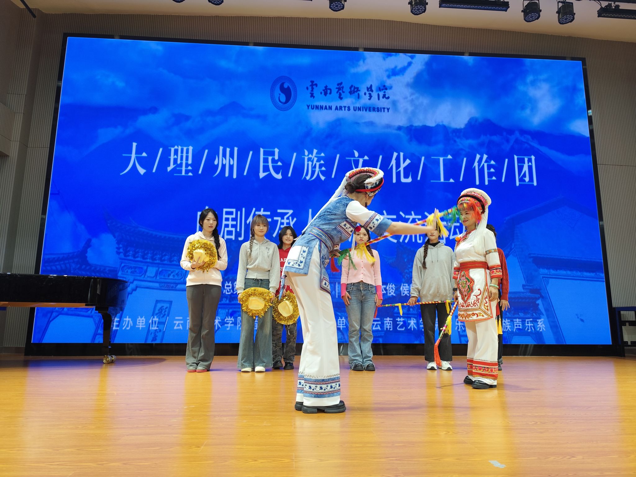 接下来,民族声乐系2022级学生沈于童、毕云菱等六名同学展示了他们在本学期所学的白剧相关内容,赵雪芳老师和董润坪老师对同学们的表演给予了高度评价与认可,并且针对其中一些白族舞蹈动作和唱腔进行了示范教学。