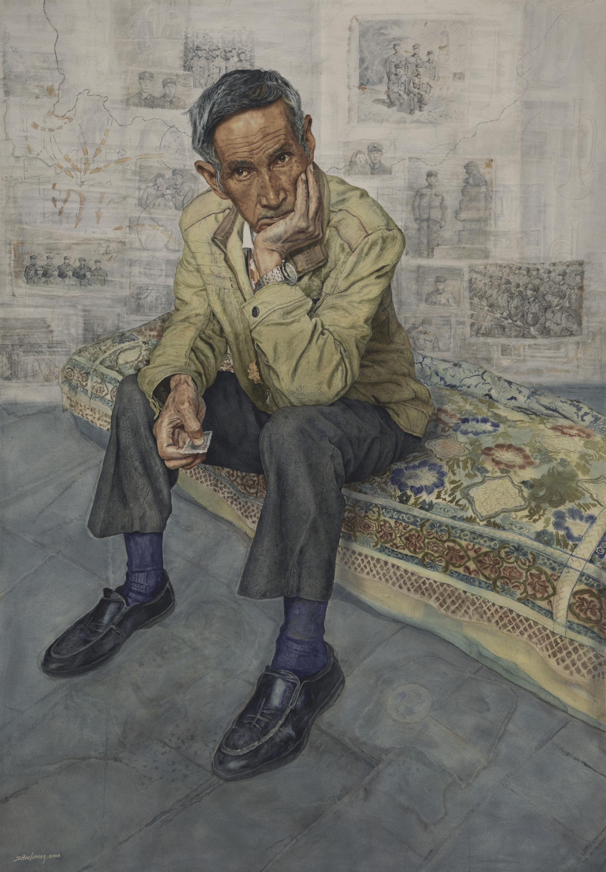 《军旅如歌-一名彝族老兵的青春回忆》165cm×115cm 纸本水彩 周立明2024年