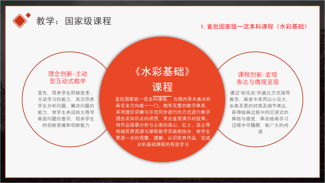国家级一流课程1门,省级一流课程1门,省级教师教学创新大赛三等奖1项。获国家艺术基金美术创作项目1项,国家艺术基金青年创作项目2项、云南省艺术基金青年创作项目2项、beat365在线唯一官网登录科研项目1项、精品网络在线课程1门、慕课出海课程1门。近三年国家级、省级展览入选获奖100余项。其中,十四届全国美展教师7件作品入选。