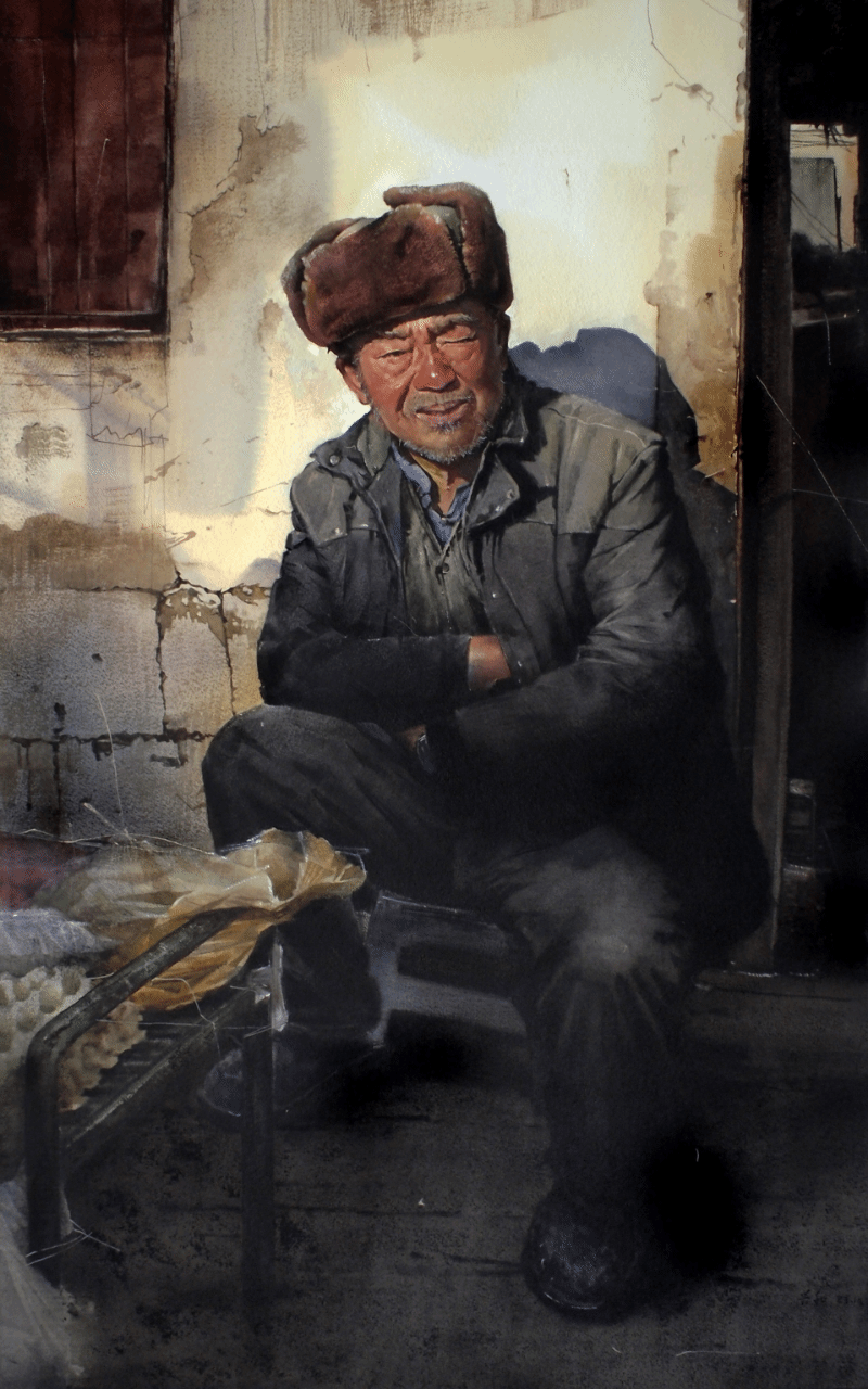 《二大爷的冬日暖阳》110cm×70cm 纸本水彩 刘兴和 2023年