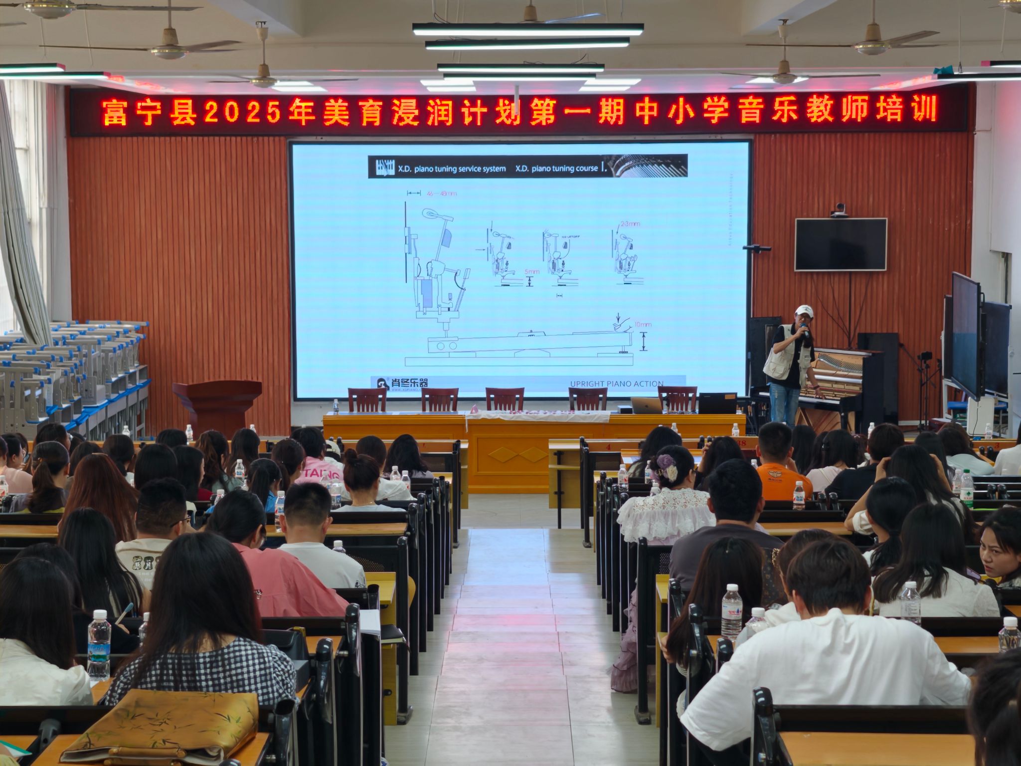 随后,钢琴基础保养课程在第四小学报告厅正式开讲。佑熙公益计划发起人、众艺教育集团有限公司总裁、资深钢琴调律肖冬老师,围绕钢琴的物理构造、国外钢琴调律课程概况、调律师的工作流程,以及钢琴的保养与简单维修等内容,为来自全县的中小学音乐教师带来了一场理论与实践并重的专题讲座。