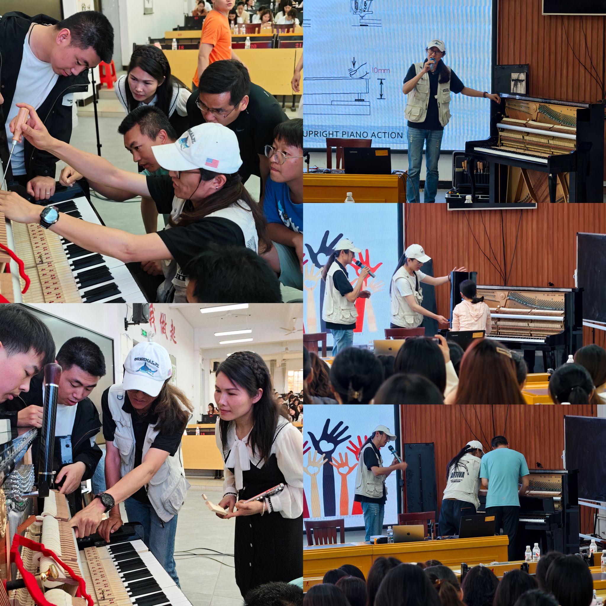 在实操环节中,肖冬老师现场演示了钢琴拆解流程,重点讲解了琴键异常处理、杂物清理和止音毡检查等要点,并通过泛音听辨方法,引导教师掌握音准问题的识别与定位技巧。随后,他组织教师分组上台实践,并向积极参与的教师代表赠送了钢琴清洁布和保养蜡,现场气氛热烈而高效。