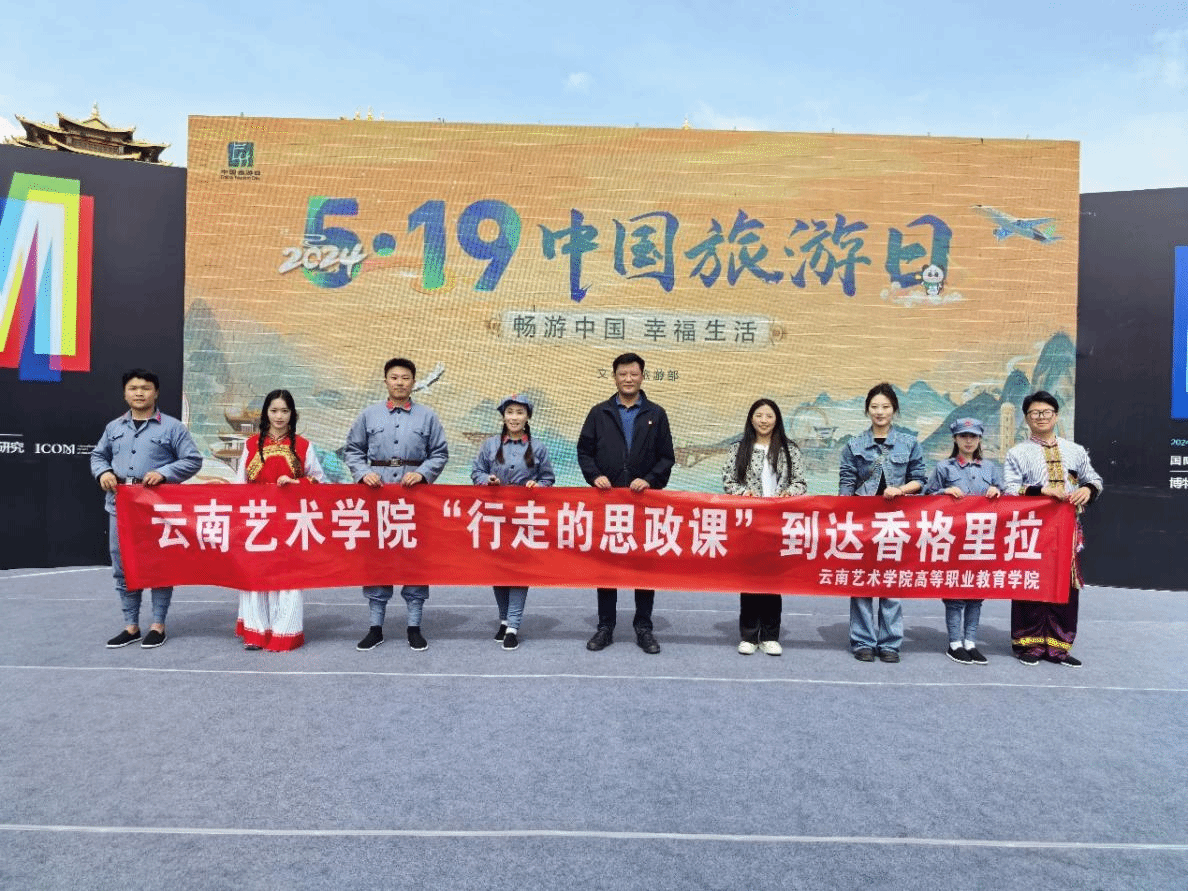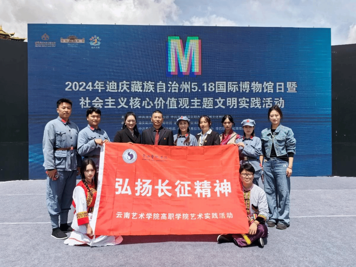 (迪庆州委宣传部副部长屈天恒、州委文明办综合科科长此仁措姆与云艺师生合影)