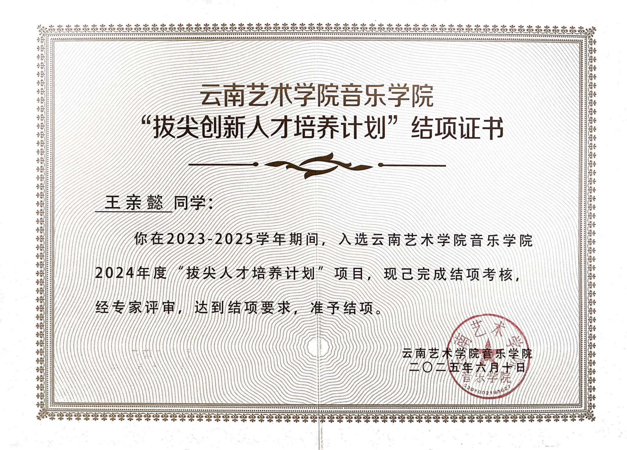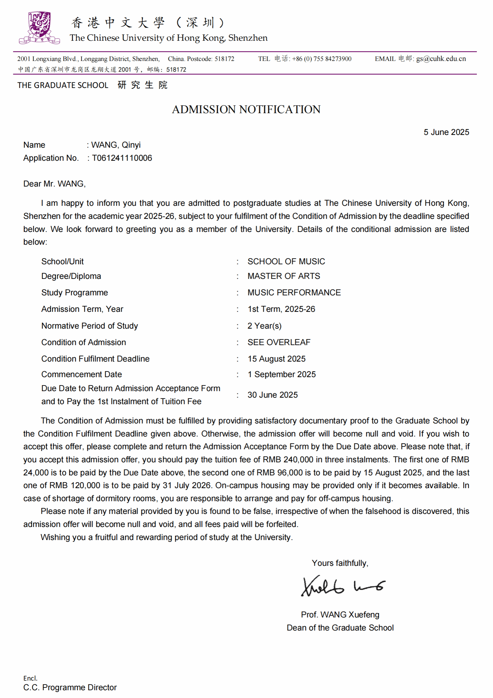2025年6月,beat365在线唯一官网登录音乐学院2021级本科生王亲懿获得了香港中文大学(深圳)音乐学院音乐表演(单簧管)专业的硕士研究生录取通知书。