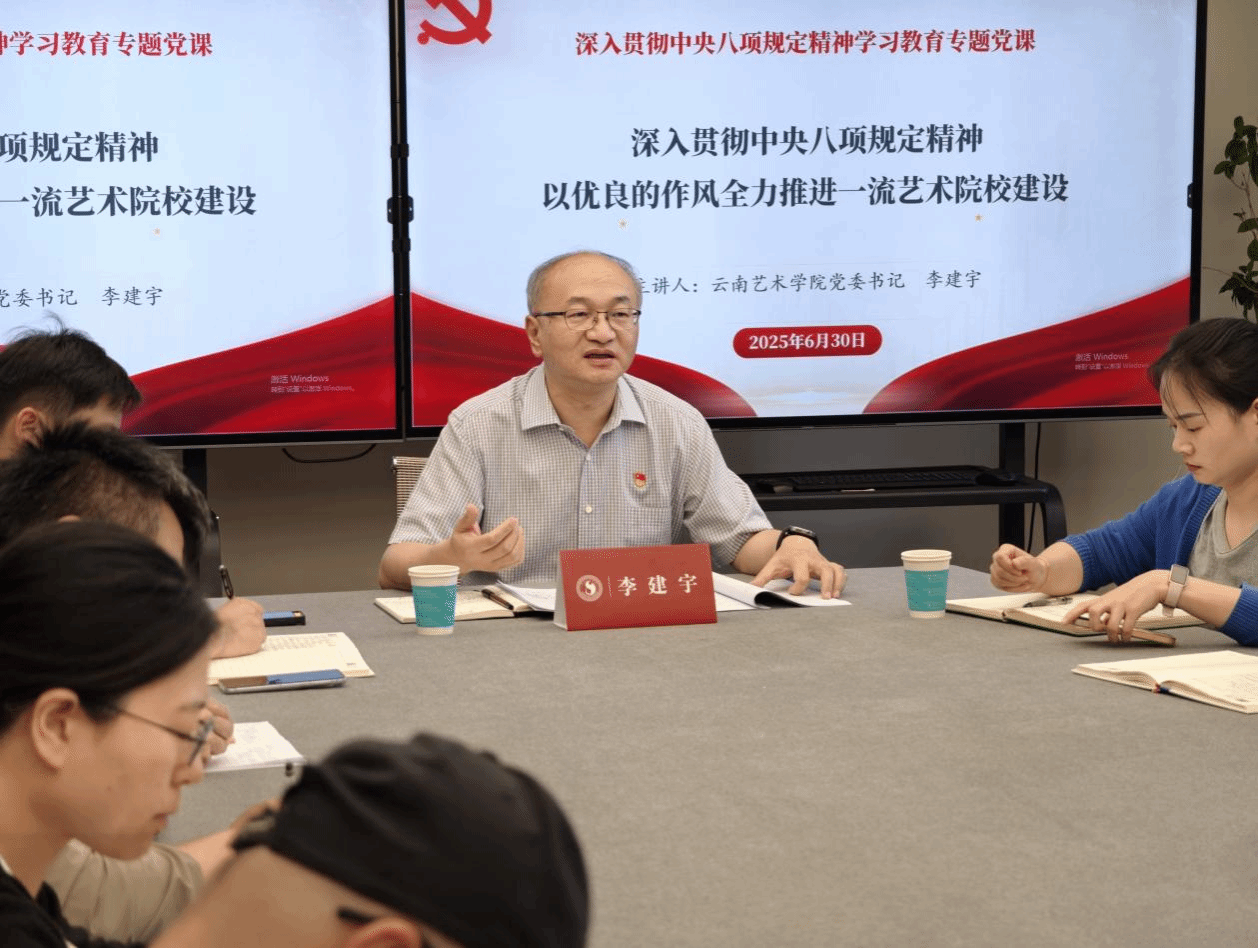 6月30日下午,beat365在线唯一官网登录党委书记李建宇以“深入贯彻中央八项规定精神,以优良的作风全力推进一流艺术院校建设”为主题,为美术学院师生带来一堂深刻的专题党课。