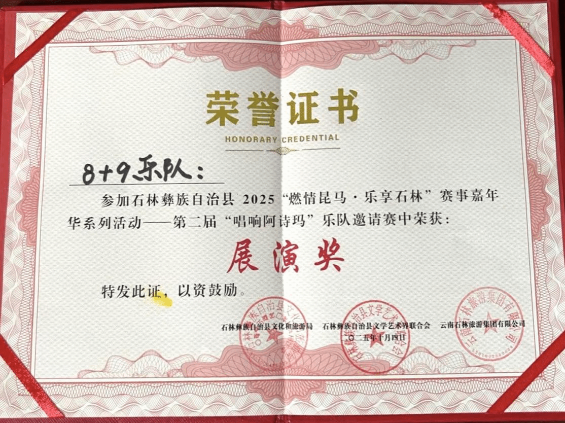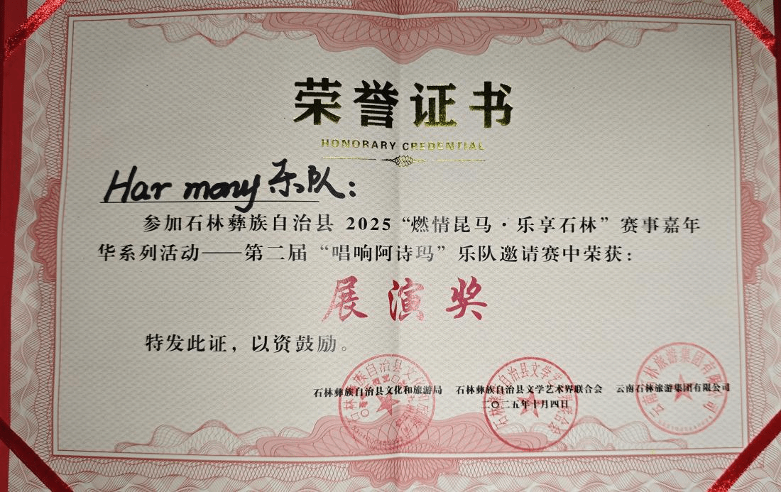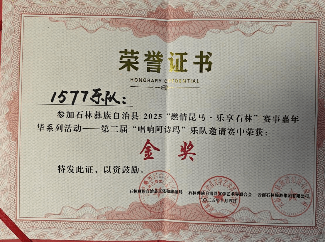 2025年10月2日至4日,“唱响阿诗玛”第二届乐队邀请赛在石林举行,本次比赛吸引了来自省内外不同地区的15支优秀乐队参赛。该项赛事是“2025燃情昆马·乐享石林”赛事嘉年华系列活动之一,由石林县文化和旅游局、石林县文学艺术联合会主办。流行音乐系三支学生乐队在比赛中用原创作品展现脱颖而出并取得优异成绩。其中1577乐队荣获金奖,Harmany乐队与8+9乐队获得展演奖。这三支获奖乐队成员分别由流行音乐系2022级和2023级学生组成,他们的参赛充分展现了我系学生在实践与舞台表演中的蓬勃活力与创造力。