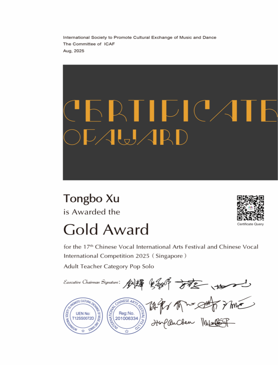 2025年8月9日,在新加坡举行的第十七届中国声乐国际大赛流行唱法教师组比赛中,流行音乐系教师徐彤博荣获金奖。本届大赛由国际音乐舞蹈交流促进会主办,于8月7日至11日在新加坡隆重举行,吸引了来自中国、新加坡、马来西亚、美国、韩国、塞尔维亚、澳大利亚等国家和地区的千余名选手同台竞技。作为依托“国际华人艺术节”的权威赛事,中国声乐国际大赛以高水准评审和国际影响力,成为华人声乐界的重要盛会。徐彤博老师凭借扎实的专业功底和极富感染力的舞台表现获得评审专家高度认可。