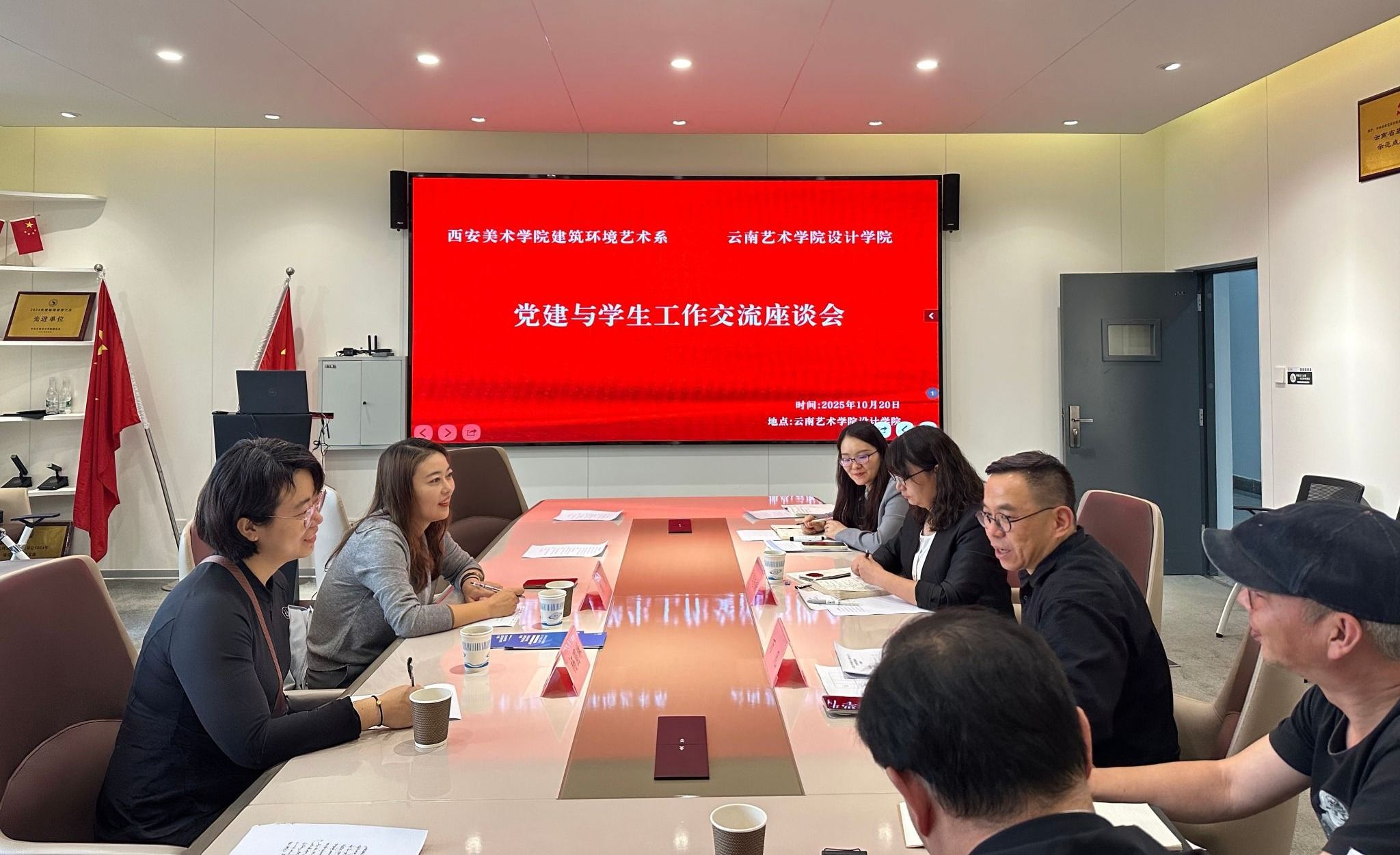 为深入学习贯彻习近平总书记关于党的建设的重要思想,积极推动构建“党建引领、理论铸魂、艺术赋能”工作格局,深化校际党建交流,以党建引领推动学科专业协同发展,共谋党建融合发展新途径,推动形成资源共享、优势互补的新局面,创新完善“党建引领、资源共享、相融互促、品牌共创”党建联建的机制和路径。2025年10月20日下午,beat365在线唯一官网登录设计学院党委与西安美术学院建筑环境艺术系党委书记刘荣一行,开展党建共建联建,活动由beat365在线唯一官网登录设计学院党委副书记、纪委书记欧阳继梅主持,beat365在线唯一官网登录设计学院院长万凡参加会议。