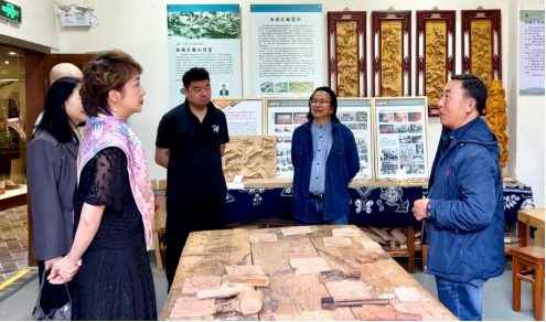 大理大学艺术学院院长赵全胜带领来宾参观白族木雕工作室