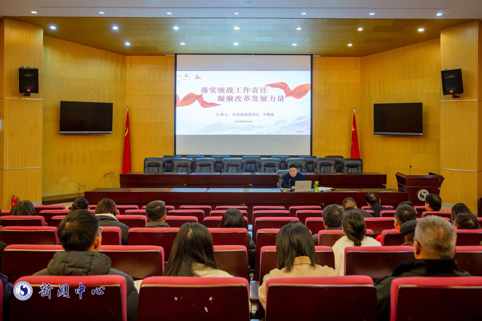 校党委委员、党委统战部部长李攀通以题为《落实统战工作责任 凝聚改革发展力量》作专题讲座。李攀通指出,党的统一战线工作取得了历史性成就,统一战线工作地位和作用更加突出。做好统一战线工作,一是要充分认识统一战线的重要法宝作用;二是要全面把握统一战线工作的重点和难点;三是要推动统一战线工作走深走实。