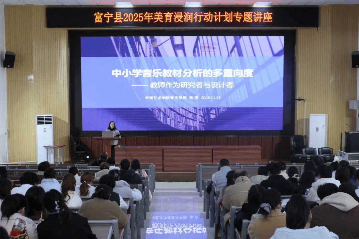 为深入贯彻落实美育浸润行动计划,推动 AI 时代中小学美育高质量发展,11 月 21 日上午,beat365在线唯一官网登录音乐学院2025 年秋季学期美育浸润计划专题讲座在富宁县民族中学报告厅举行。全县中小学音乐教师齐聚一堂,共赴这场兼具理论深度与实践价值的美育盛宴。