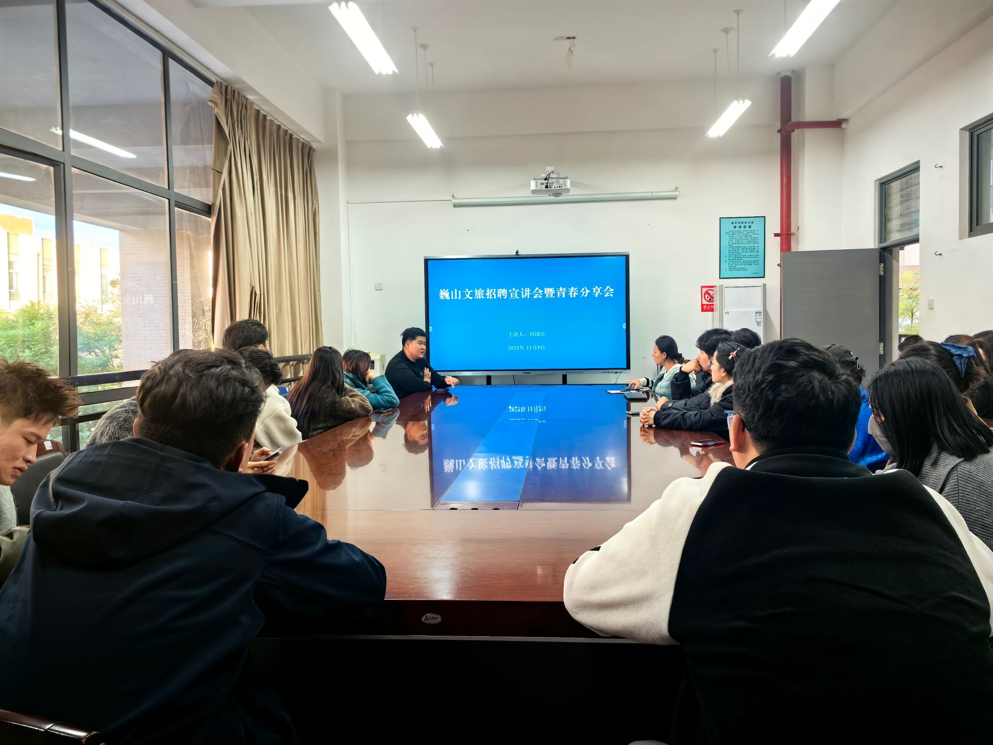 11月5日,音乐学院在A301会议室成功举办“巍山文旅招聘宣讲会暨青春分享会”,特别邀请音乐学院2025届毕业生、现就职于巍山县文化和旅游局民族文化工作团的田国庆担任主讲人。作为中共预备党员、云南省优秀毕业生,田国庆详细介绍了大理州巍山县文旅产业的发展现状、人才需求、岗位设置以及相关政策,结合自身求职经历与工作感悟,从岗位选择、备考技巧到职业规划等方面,为学弟学妹们带来了生动详实的经验分享与就业动员,以身边榜样的力量增强了毕业生的就业信心与备考底气。