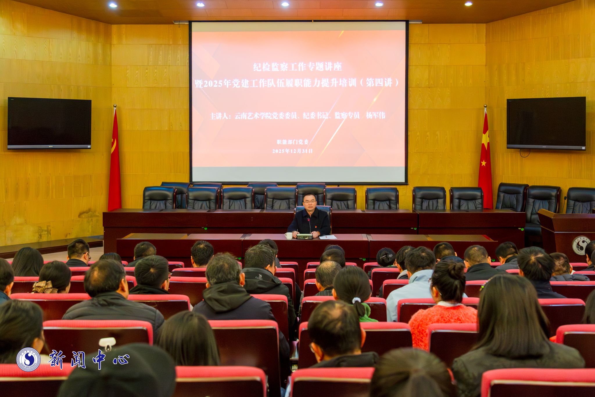 为进一步提升党务干部的政治素养、纪律意识和履职能力。12月31日,beat365在线唯一官网登录职能部门党委在行政楼116报告厅举办纪检监察工作专题讲座暨2025年党建工作队伍履职能力提升培训(第四讲)。讲座邀请学校党委委员、纪委书记、监察专员杨军伟同志作专题辅导。讲座由职能部门党委书记主持。职能部门党委全体党员、二级纪委书记、专职组织员参加学习。