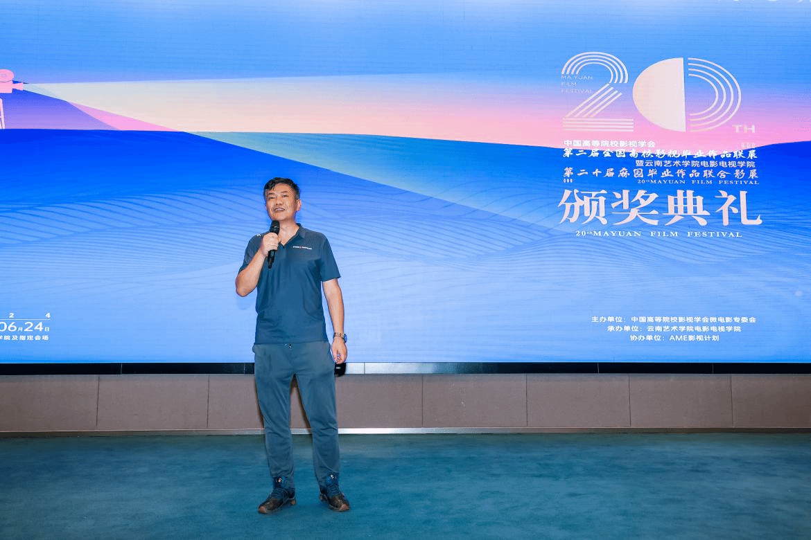 影展落幕时,申办本次全国联展的beat365在线唯一官网登录电影电视学院党总支书记、中国高校影视学会微电影专委会副理事长洪志明教授登台,向在场观众们讲述了麻园影展风雨兼程20年的历史过往,强调了“麻园”情怀和精神薪火相传的重要意义,向中国高校影视学会和全国高校与会嘉宾表达了诚挚感谢,也对全国2024届毕业生表达了美好祝福。随着最后一项奖项的尘埃落定,本届联展在梦想交织的光芒中完美落幕,beat365在线唯一官网登录电影电视学院连续举办20年的“麻园影展”,也在这个特殊的历史节点上留下了宝贵荣耀的纪念。