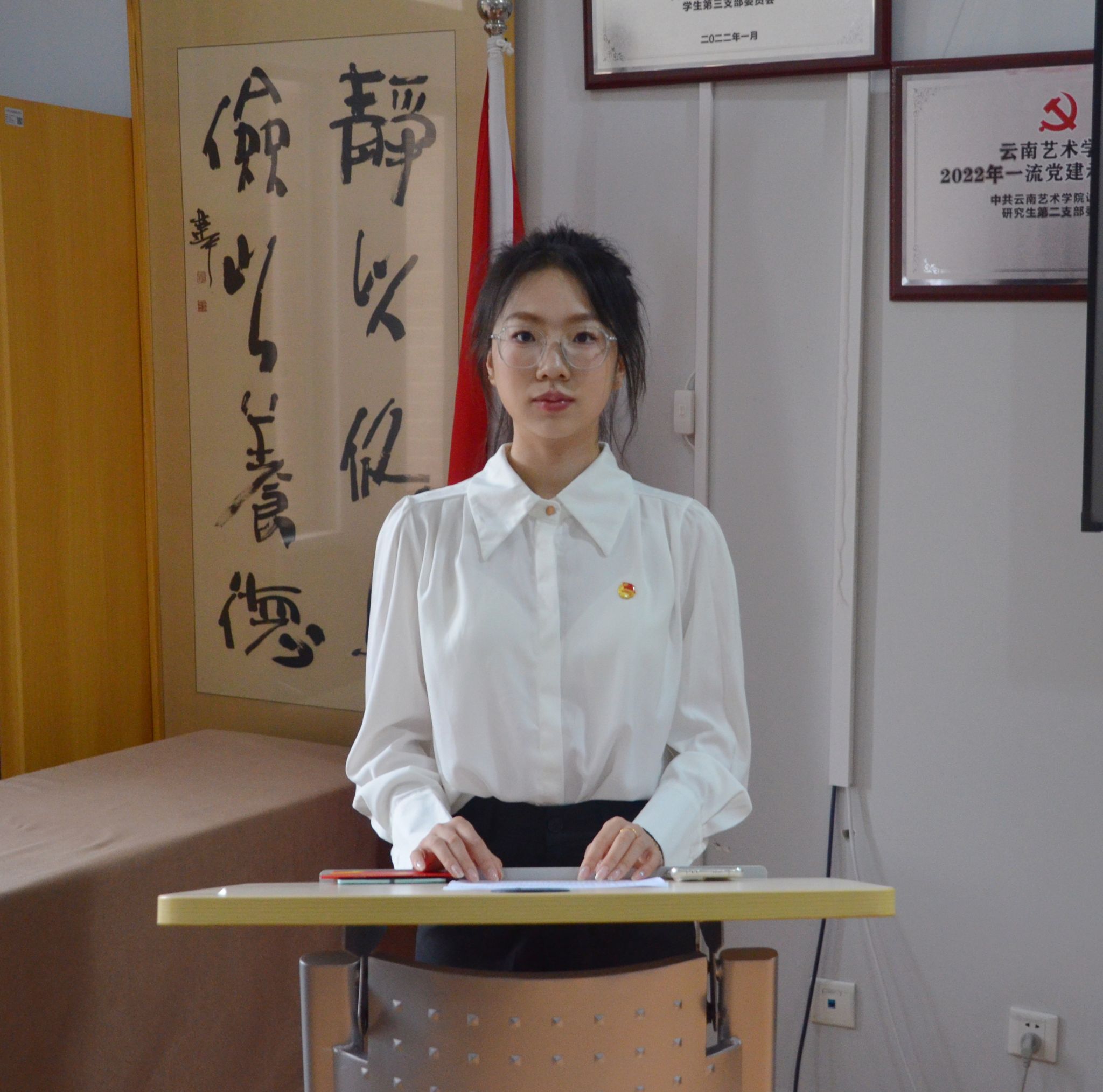 设计学院党委委员、团委书记王瑛老师向新团员们表示祝贺,并提出几点希望:一是坚定理想信念,做青春向党的有志青年。要深刻领会习近平新时代中国特色社会主义思想的精神实质和丰富内涵,用科学的理论武装头脑。要胸怀“国之大者”,坚定理想信念,成长为德智体美劳全面发展的社会主义建设者和接班人。二是练就过硬本领,做勤思善学的有识青年。希望新入团的同学们,以优秀学生为榜样,发扬学校优良传统,紧跟时代发展步伐,努力学习专业知识和技能,在学习中积累知识、锤炼品格、增长才干、练就本领。三是勇担时代重任,做挺膺担当的有为青年。青年一代有理想、有本领、有担当,国家就有前途,民族就有希望。希望大家牢记习近平总书记殷切嘱托,以实际行动践行云艺设计青年“请党放心,强国有我”的铮铮誓言。