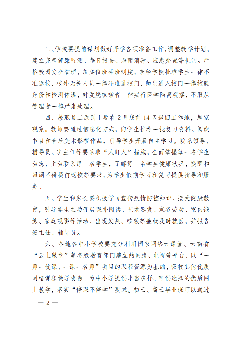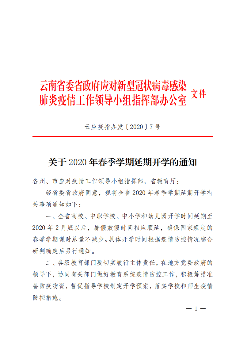 关于 2020 年春季学期延期开学的通知