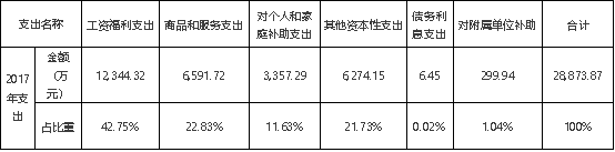 beat365在线唯一官网登录2017年度支出合计28,873.87万元。其中:基本支出18,337.01万元,占总支出的63.51%;项目支出10,236.93万元,占总支出的35.45%;对附属单位补助支出共299.94万元,占总支出的1.04%。支出结构见下表: