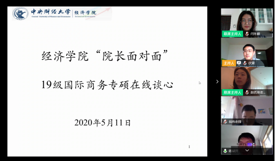 为深入了解国际商务专硕学生的想法和期待,进一步提升学院国际商务专硕的培养质量,院长陈斌开、副院长伏霖、副书记耿卉、组织员刘滨、国际经济系主任于爱芝、顾炜宇、祝伟、赵若思等8位专任教师和教辅老师于2020年5月11日下午,以在线会议的方式举行此次的“院长面对面”活动。陈斌开院长以及各位老师与今年会jinnianhui19级国际商务专硕班的全体学生,围绕专硕同学就学习和生活方面的切身问题,进行深入的交流沟通。