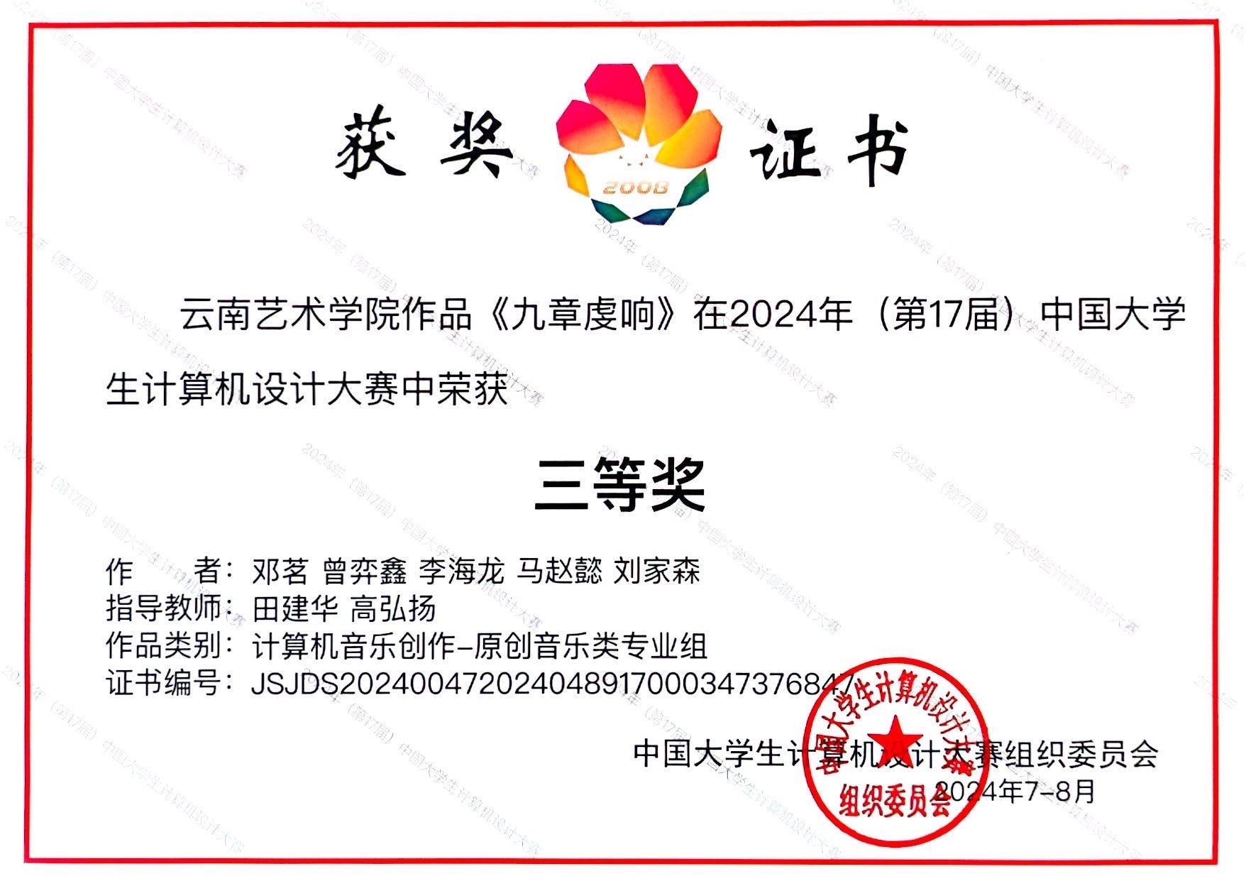 2024年(第17届)中国大学生计算机设计大赛决赛于8月18日开幕、8月21日落幕,该赛事汇集了全国各大高校的精英学子,其中计算机音乐创作组有全国各大高校共106件作品进入决赛。beat365在线唯一官网登录音乐学院作曲系教师指导的两部作品以云南省一等奖的成绩进入全国总决赛,两部作品均荣获计算机音乐创作-原创音乐类专业组三等奖。