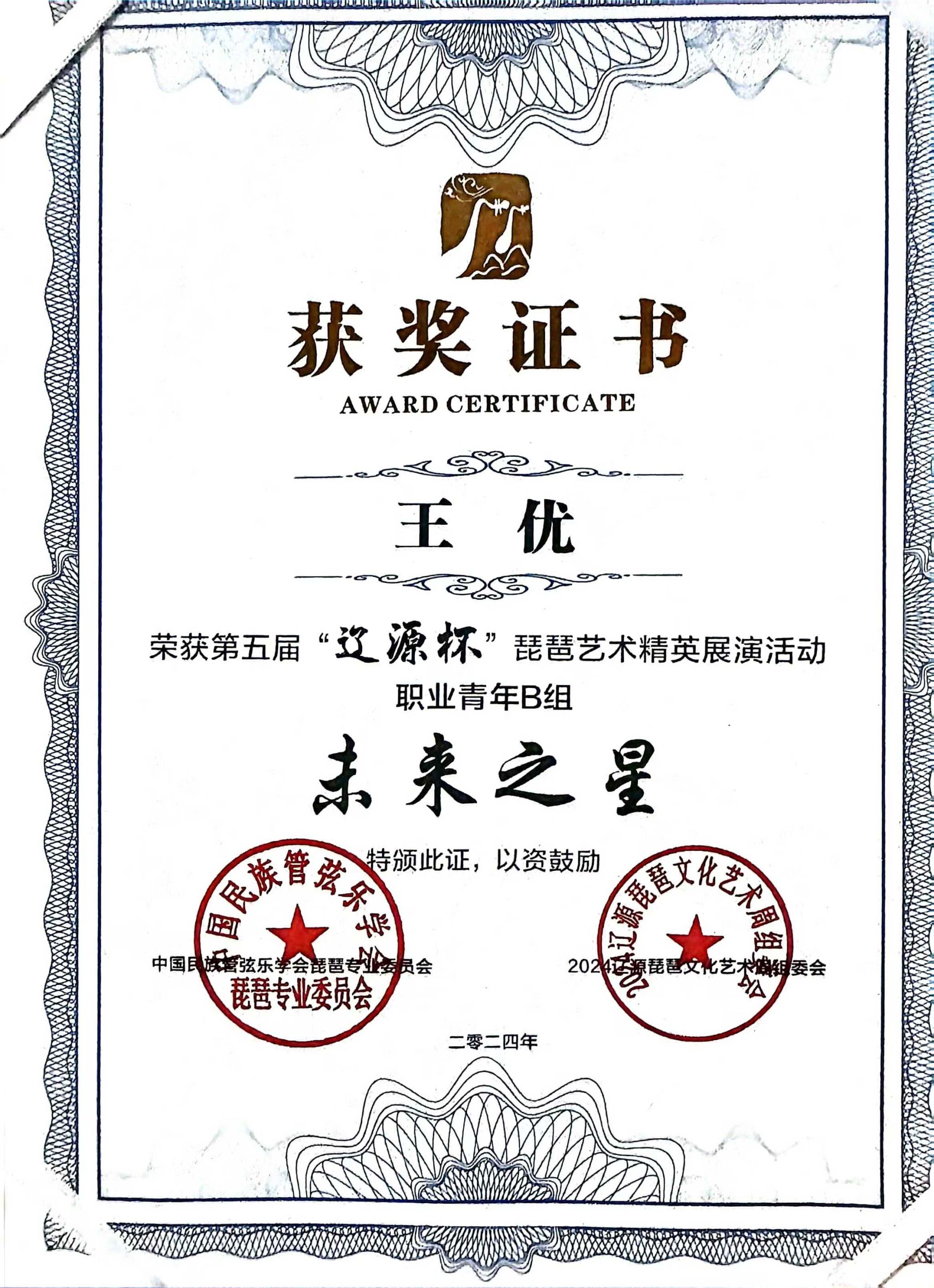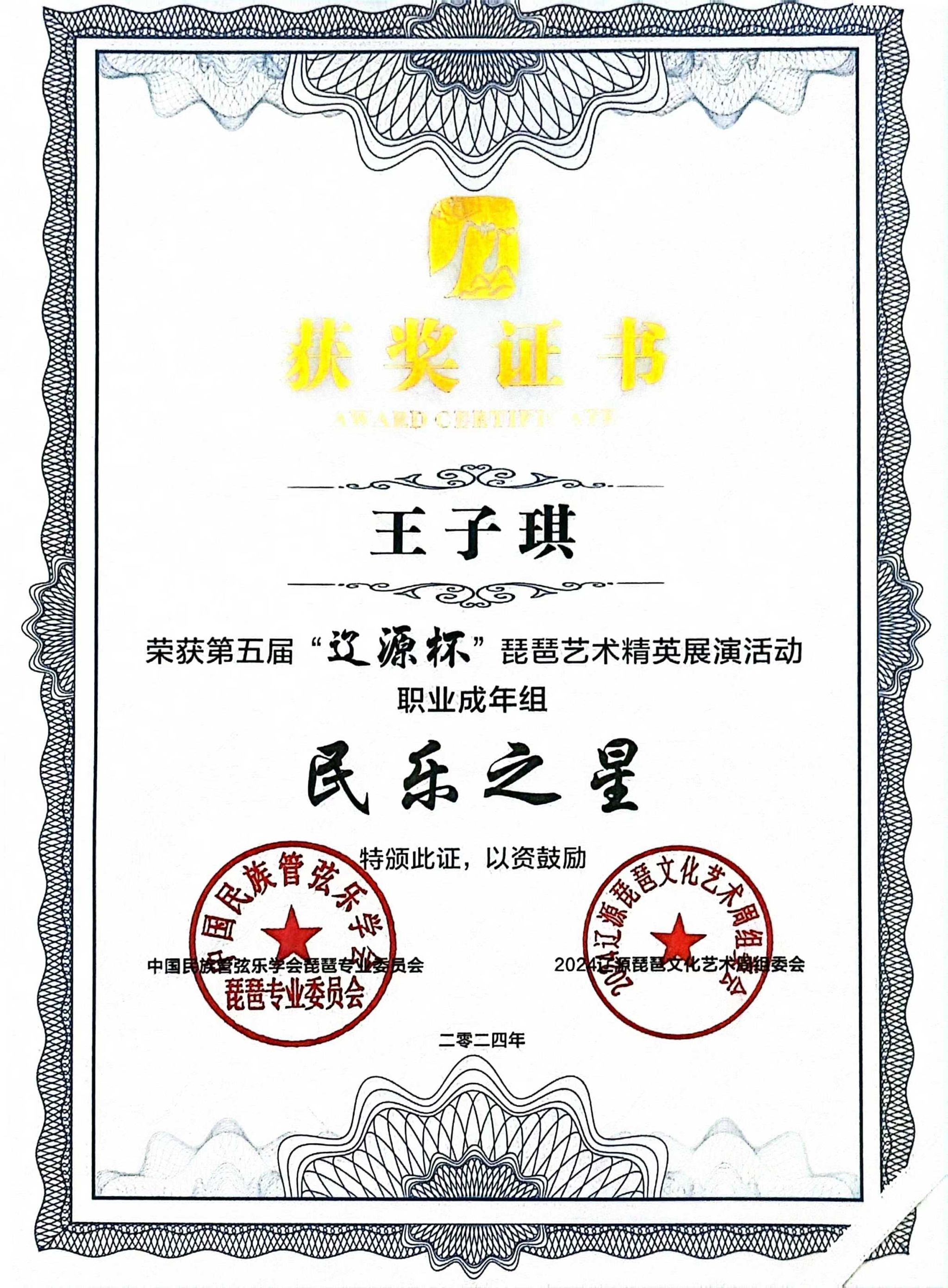2024年8月1日至5日,由中共辽源市委、辽源市人民政府、中国民族管弦乐学会琵琶专业委员会、吉林省民族管弦乐学会主办的第五届“辽源杯”琵琶艺术精英展演活动在吉林省辽源市举行。音乐学院研究生班王子琪获职业成年组“民乐之星”,2023级国乐班邱钰涵获职业青年B组“民乐之星”,2020级国乐班王优、2023级国乐班刘自然分别获职业青年B组“未来之星”,由王子琪、王优、邱钰涵、刘自然组成的“花韵云音”获职业重奏组“未来之星”。国乐系教师赵红获“优秀指导教师”。