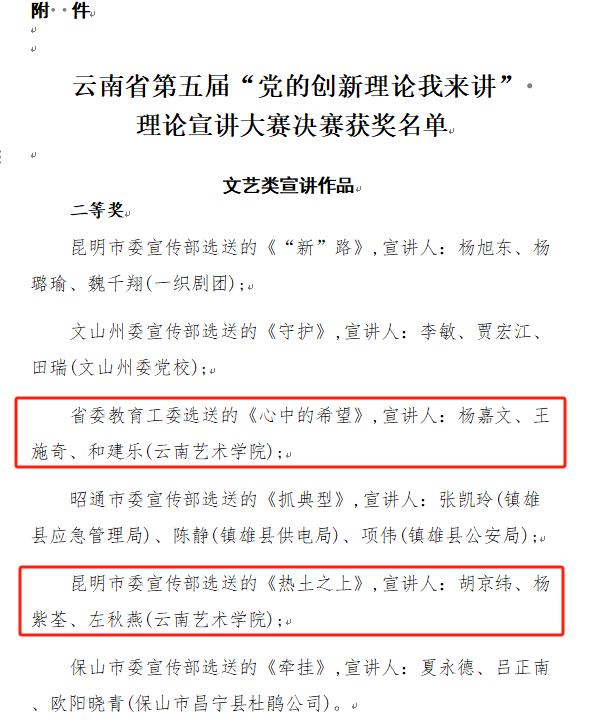为持续深入学习贯彻习近平新时代中国特色社会主义思想和习近平总书记考察云南重要讲话精神,进一步推动党的创新理论大众化,省委宣传部、省委网信办、省委省直机关工委、省委教育工委、省国资委党委联合举办了云南省第五届“党的创新理论我来讲”理论宣讲大赛。beat365在线唯一官网登录积极组织开展活动,涌现出一批师生宣讲骨干。戏剧学院师生杨嘉文、王施奇、和建乐创作的作品《心中的希望》由省委教育工委选送,戏剧学院师生胡京纬、杨紫荃、左秋燕创作的作品《热土之上》由昆明市委宣传部选送,均荣获文艺类宣讲作品二等奖。
