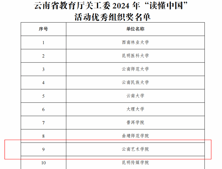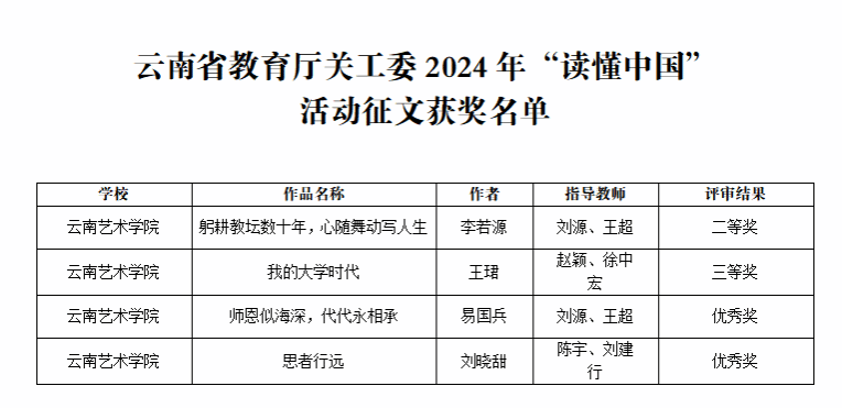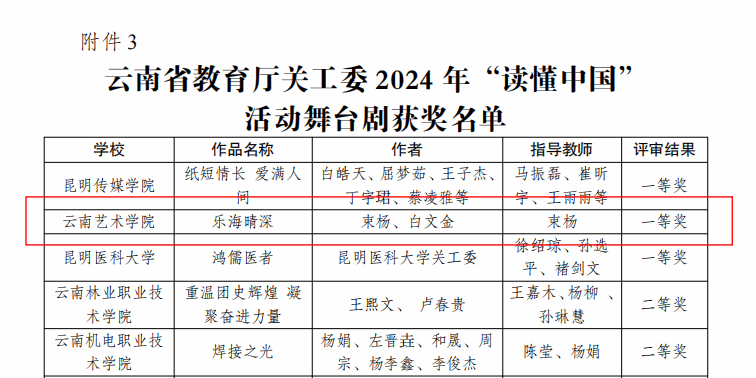 近日,云南省教育厅关心下一代工作委员会公布了2024年“读懂中国”活动评审结果,由beat365在线唯一官网登录组织征集的多个作品入选。其中,舞台剧《乐海晴深》获一等奖,征文类获二等奖一个、三等奖一个、优秀奖两个,beat365在线唯一官网登录获评优秀组织单位。