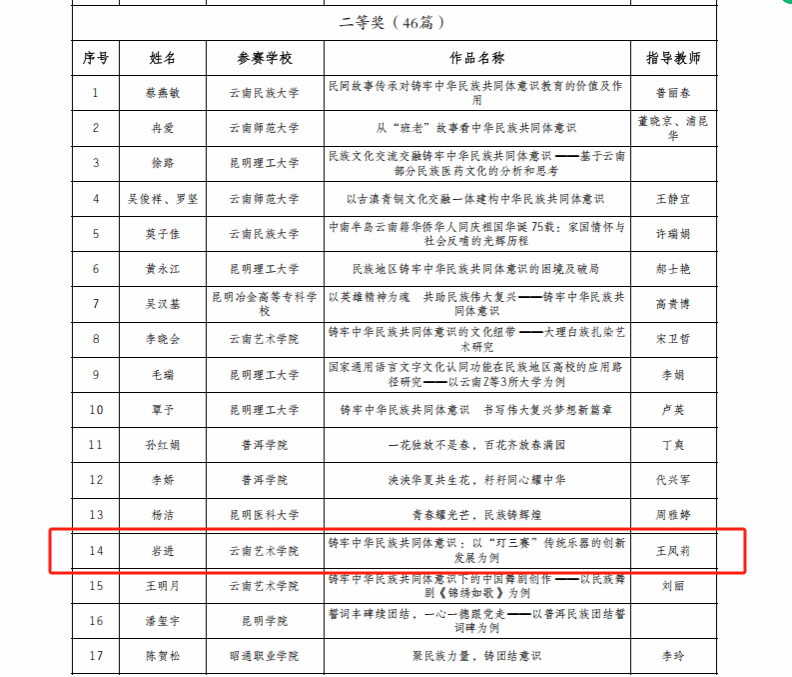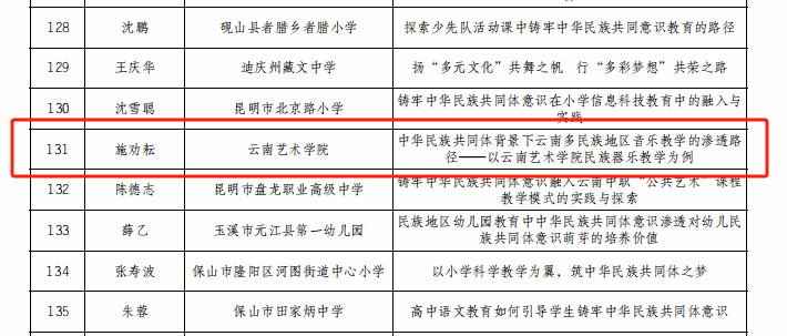 为深入学习贯彻习近平总书记关于加强和改进民族工作的重要思想和全国民族团结进步表彰大会精神,持续深化学校铸牢中华民族共同体意识教育、不断丰富教育实践活动形式,省教育厅、省民族宗教委组织开展了2024年度云南省学校铸牢中华民族共同体意识教育征文活动。音乐学院国乐系教师施劝耘《中华民族共同体背景下云南多民族地区音乐教学的渗透路径——以beat365在线唯一官网登录民族器乐教学为例》获教师组一等奖,2021级民族音乐理论班学生岩进《铸牢中华民族共同体意识:以“玎三赛”传统乐器的创新发展为例》(指导教师:王凤莉)获大学生组二等奖。