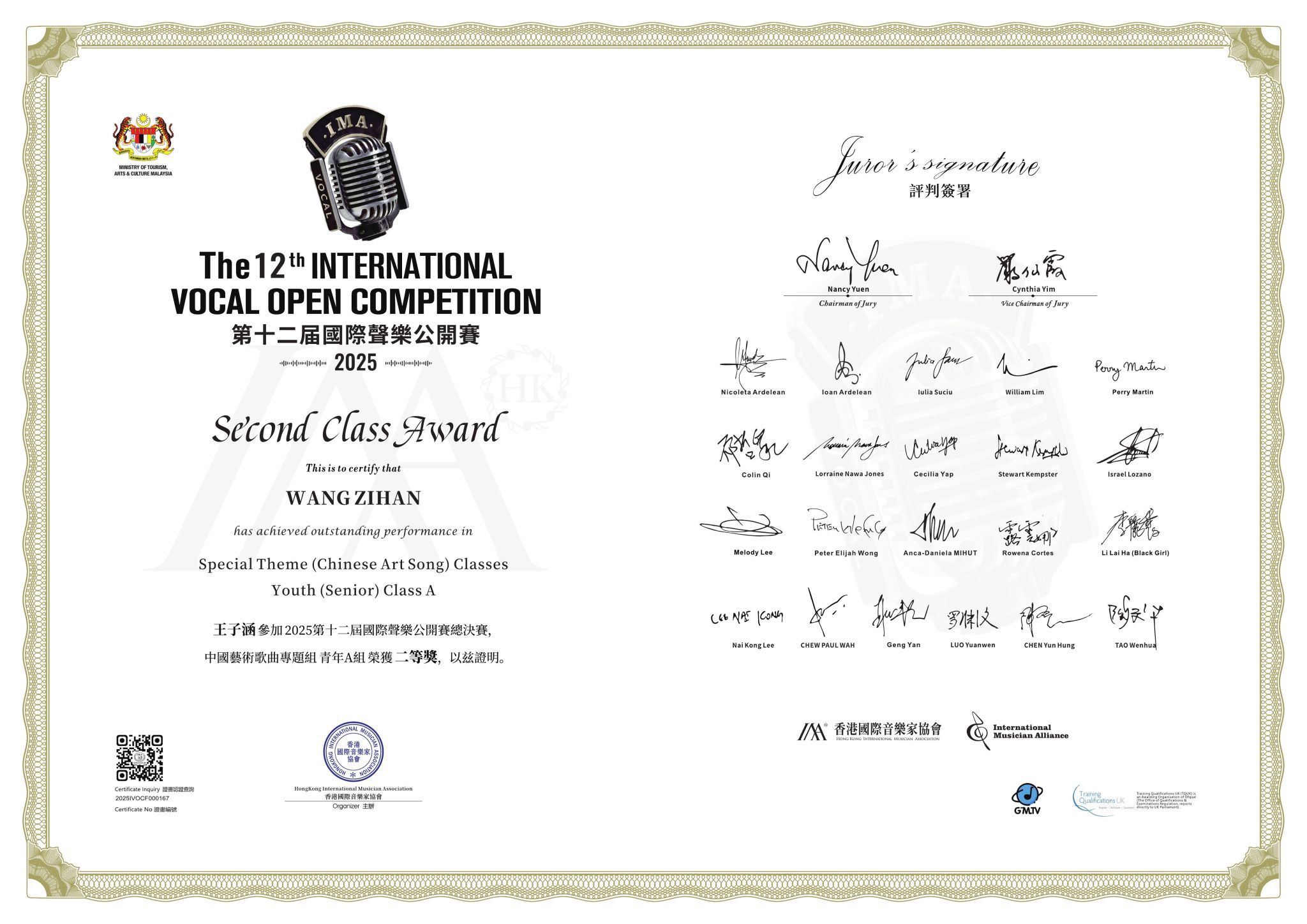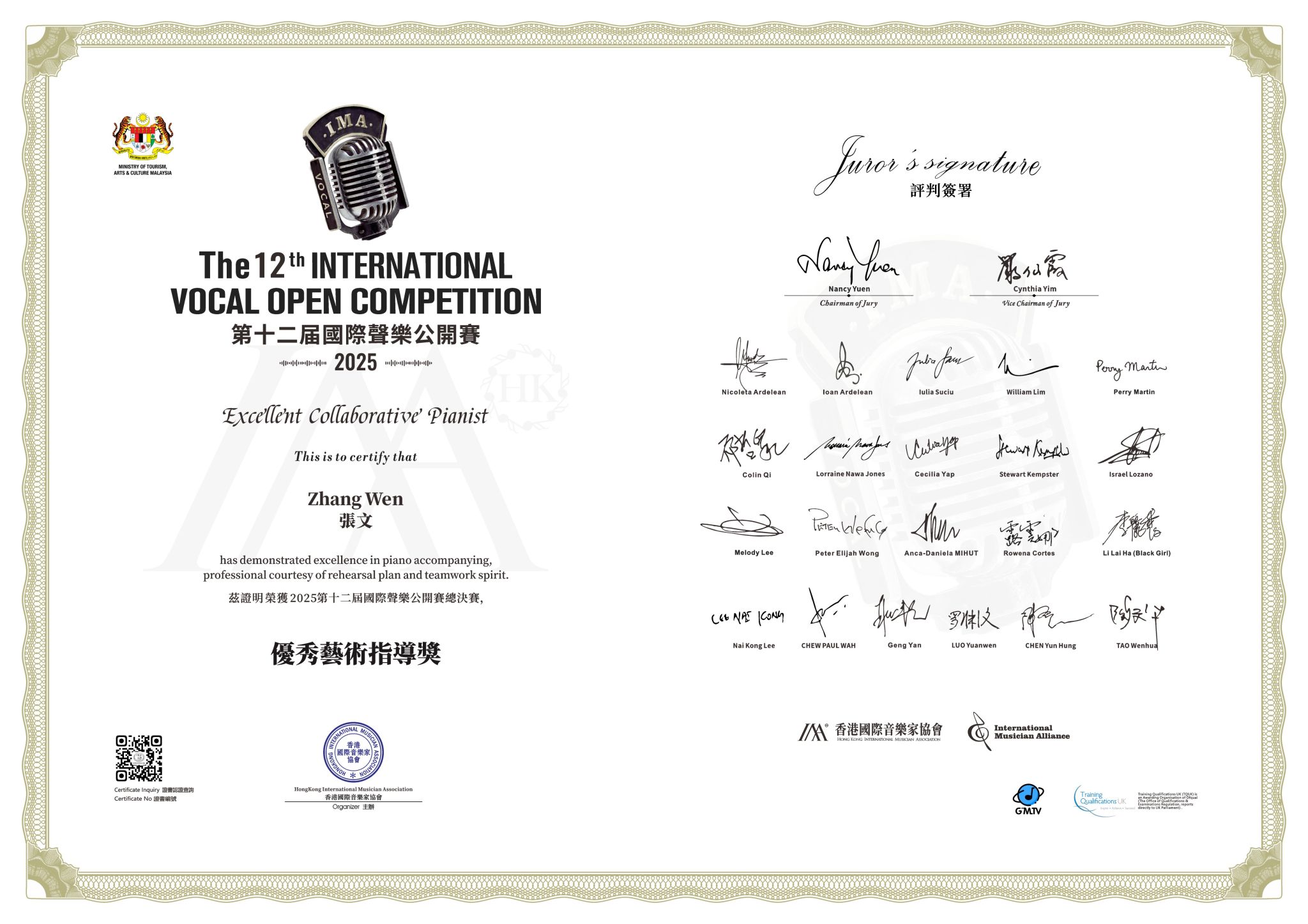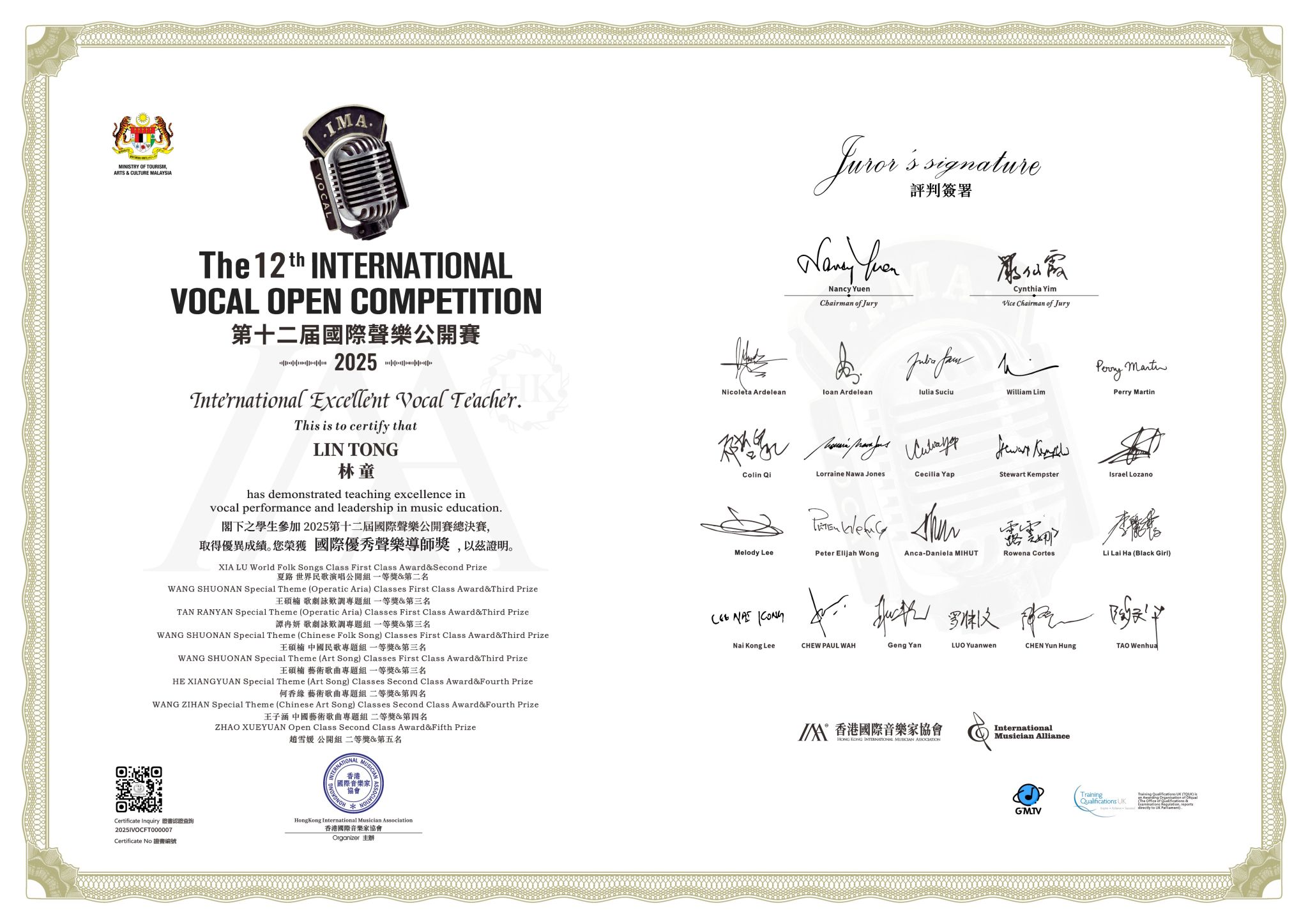 2025年1月17-21日,2025年第十二届国际声乐公开赛全球总决赛在马来西亚·吉隆坡举行。beat365在线唯一官网登录音乐学院声歌系师生喜获佳绩:硕士研究生夏路荣获“世界民歌演唱公开组一等奖”,硕士研究生谭冉研荣获歌剧咏叹调专题组青年A组一等奖,硕士研究生何香缘获得艺术歌曲专题组青年A组二等奖,硕士研究生张骏腾获得中国艺术歌曲专题组青年A组二等奖,本科生王子涵获得中国艺术歌曲专题组青年A组二等奖,硕士研究生何香缘获得歌剧咏叹调专题组青年A组三等奖,硕士研究生李蕊彤获得歌剧咏叹调专题组青年B组三等奖 ;林童教授荣获“国际优秀声乐导师奖”,青年教师张文荣获“优秀艺术指导奖”。