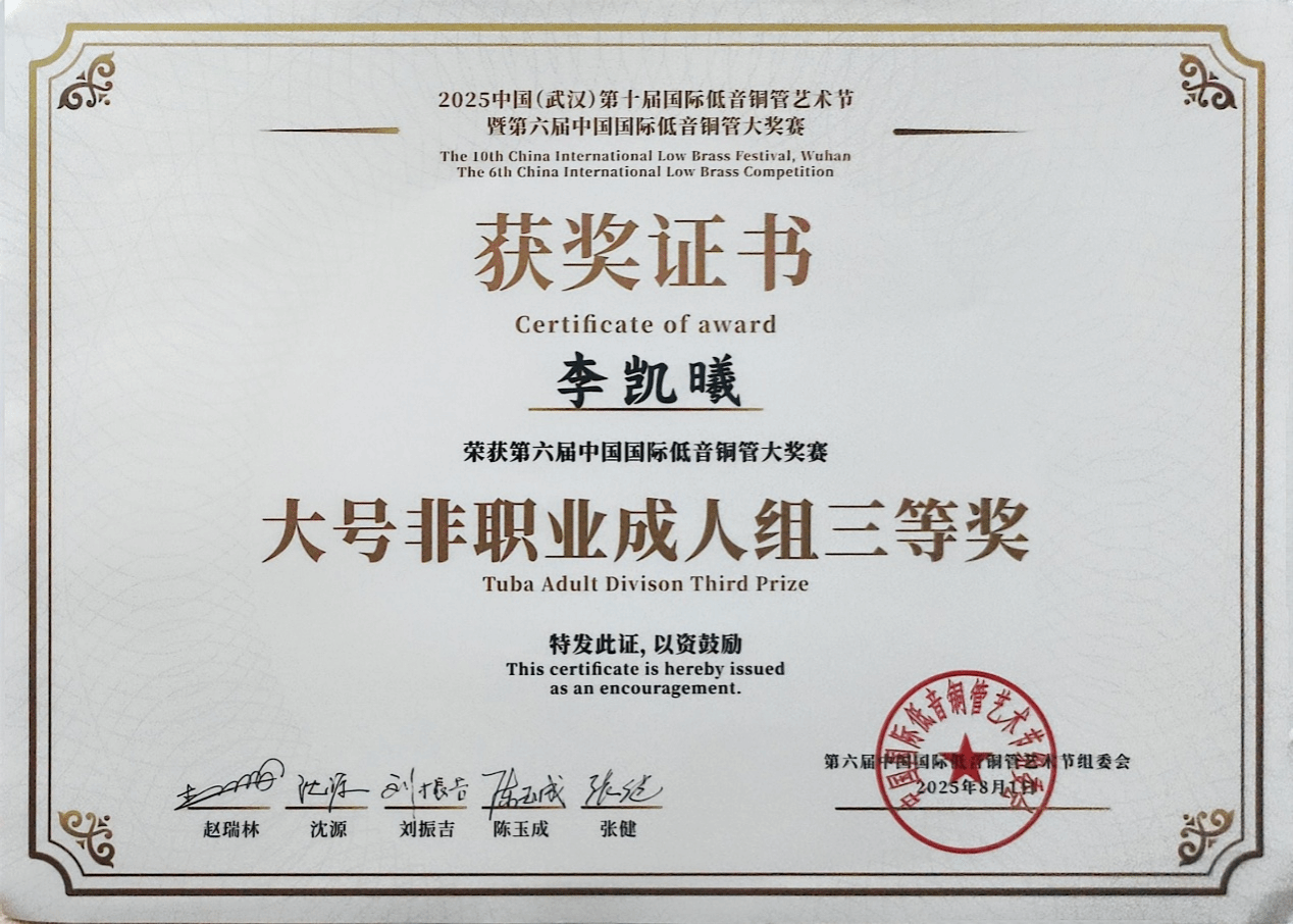 2025年第六届中国(国际)低音铜管大奖赛是第十届中国(武汉)国际低音铜管艺术节的核心赛事,于2025年7月31日至8月1日在武汉东西湖区临空港艺术中心及临空港大剧院举行。该赛事由中国乐器协会管乐专业委员会主办,武汉临空港保利大剧院有限公司协办,中国音协管乐学会低音铜管专业委员会指导,旨在推动低音铜管艺术发展并促进国际文化交流。beat365在线唯一官网登录音乐学院管弦系2022级管弦打击乐演奏班学生李凯曦进入决赛,获得非职业成人组三等奖(指导教师:赵华)。